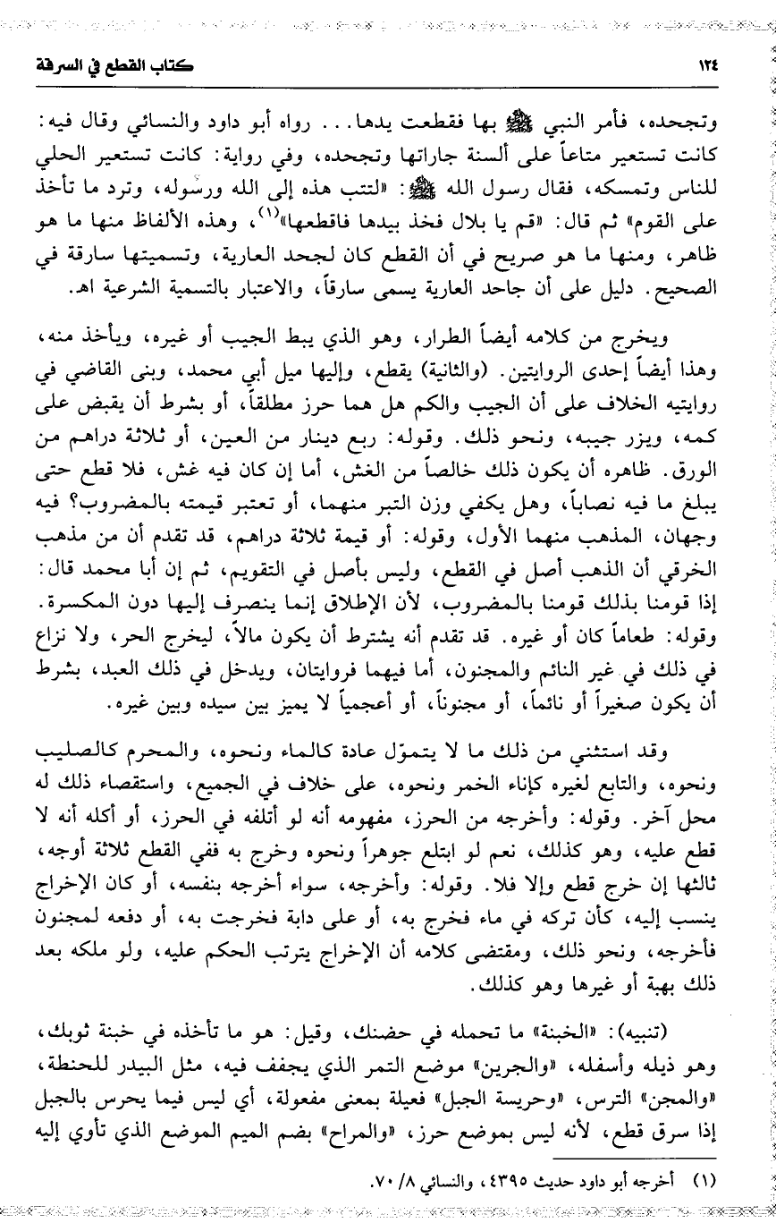 ( تنبيه ) : ( الخبنة ) ما تحمله في حضنك ، وقيل : هو ما تأخذه في خبنة ثوبك ، وهو ذيله وأسفله ، ( والجرين ) موضع التمر الذي يجفف فيه ، مثل البيدر للحنطة ، ( والمجن ) الترس ، ( وحريسة الجبل ) فعيلة بمعنى مفعولة ، أي ليس فيما يحرس بالجبل إذا سرق قطع ، لأنه ليس بموضع حرز ، ( والمراح ) بضم الميم الموضع الذي تأوي إليه