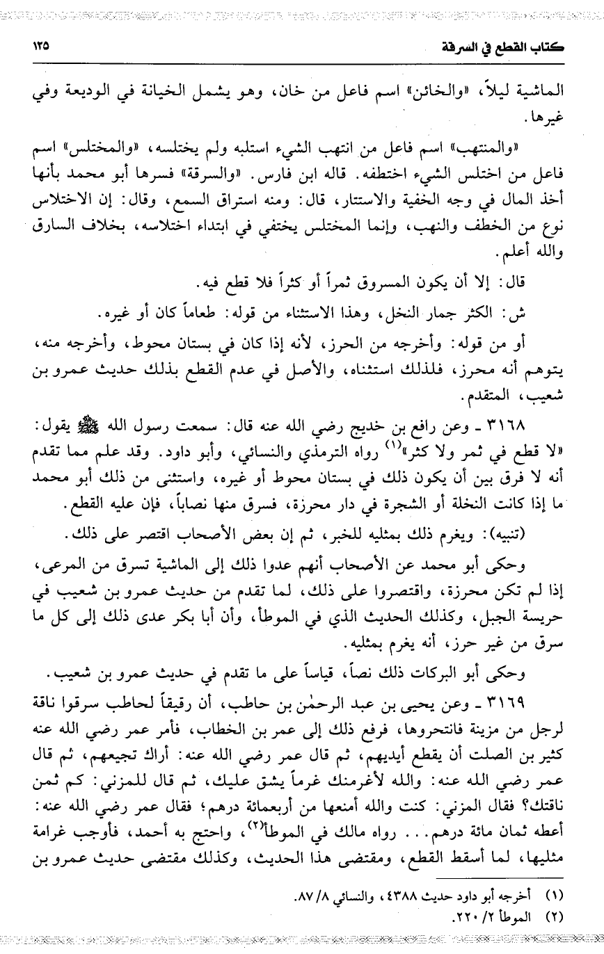 3169 وعن يحيى بن عبد الرحمن بن حاطب ، أن رقيقاً لحاطب سرقوا ناقة لرجل من مزينة فانتحروها ، فرفع ذلك إلى عمر بن الخطاب ، فأمر عمر رضي الله عنه كثير بن الصلت أن يقطع أيديهم ، ثم قال عمر رضي الله عنه : 16 ( أراك تجيعهم ، ثم قال عمر رضي الله عنه : والله لأغرمنك غرماً يشق عليك ، ثم قال للمزني : كم ثمن ناقتك ؟ فقال المزني : كنت والله أمنعها من أربعمائة درهم ؛ فقال عمر رضي الله عنه : أعطه ثمان مائة درهم ) . . . رواه مالك في الموطأ ، واحتج به أحمد ، فأوجب غرامة مثليها ، لما أسقط القطع ، ومقتضى هذا الحديث ، وكذلك مقتضى حديث عمرو بن
