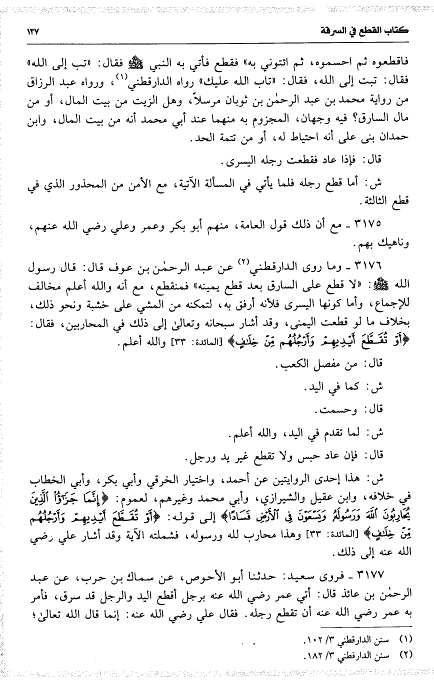 فاقطعوه ثم احسموه ، ثم ائتوني به ) فقطع فأتي به النبي فقال : ( تب إلى الله ) فقال : تبت إلى الله ، فقال : ( تاب الله عليك ) رواه الدارقطني ، ورواه عبد الرزاق من رواية محمد بن عبد الرحمن بن ثوبان مرسلاً ، وهل الزيت من بيت المال ، أو من مال السارق ؟ فيه وجهان ، المجزوم به منهما عند أبي محمد أنه من بيت المال ، وابن حمدان بنى على أنه احتياط له ، أو من تتمة الحد .