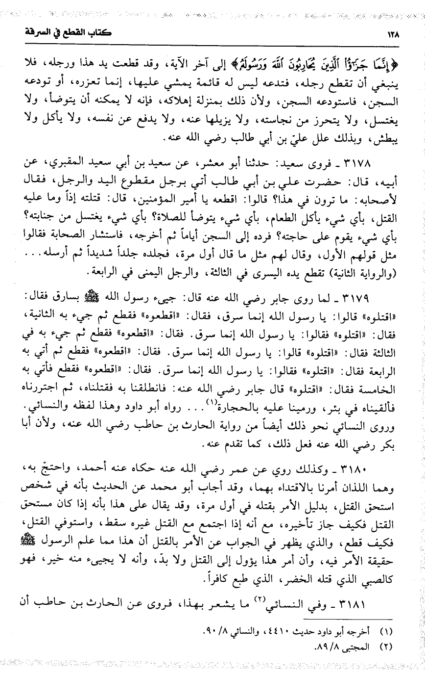 3177 فروى سعيد : حدثنا أبو الأحوص ، عن سماك بن حرب ، عن عبد الرحمن بن عائذ قال : أتي عمر رضي الله عنه برجل أقطع اليد والرجل قد سرق ، فأمر به عمر رضي الله عنه أن تقطع رجله . فقال علي رضي الله عنه : إنما قال الله تعالى ؛ 19 ( { إنما جزاء الذين يحاربون الله ورسوله } ) إلى آخر الآية ، وقد قطعت يد هذا ورجله ، فلا ينبغي أن تقطع رجله ، فتدعه ليس له قائمة يمشي عليها ، إنما تعزره ، أو تودعه السجن ، فاستودعه السجن ، ولأن ذلك بمنزلة إهلاكه ، فإنه لا يمكنه أن يتوضأ ، ولا يغتسل ، ولا يتحرز من نجاسته ، ولا يزيلها عنه ، ولا يدفع عن نفسه ، ولا يأكل ولا يبطش ، وبذلك علل عليّ بن أبي طالب رضي الله عنه .
