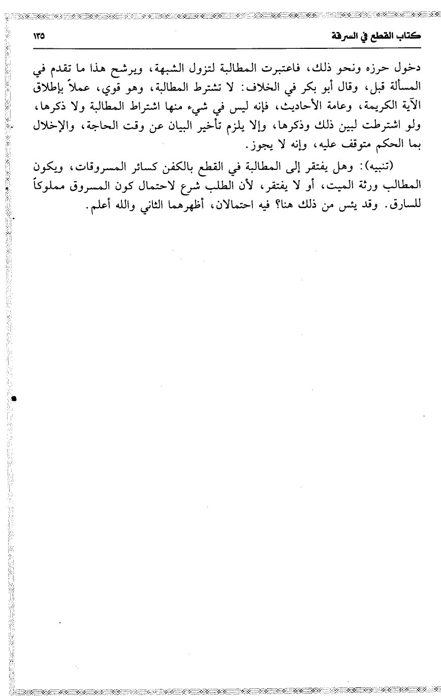 دخول حرزه ونحو ذلك ، فاعتبرت المصالبة لتزول الشبهة ، ويرشح هذا ما تقدم في المسألة قبل ، وقال أبو بكر في الخلاف : لا تشترط المطالبة ، وهو قوي ، عملاً بإطلاق الآية الكريمة ، وعامة الأحاديث ، فإنه ليس في شيء منها اشتراط المطالبة ولا ذكرها ، ولو اشترطت لبين ذلك وذكرها ، وإلا يلزم تأخير البيان عن وقت الحاجة ، والإخلال بما الحكم متوقف عليه ، وإنه لا يجوز .