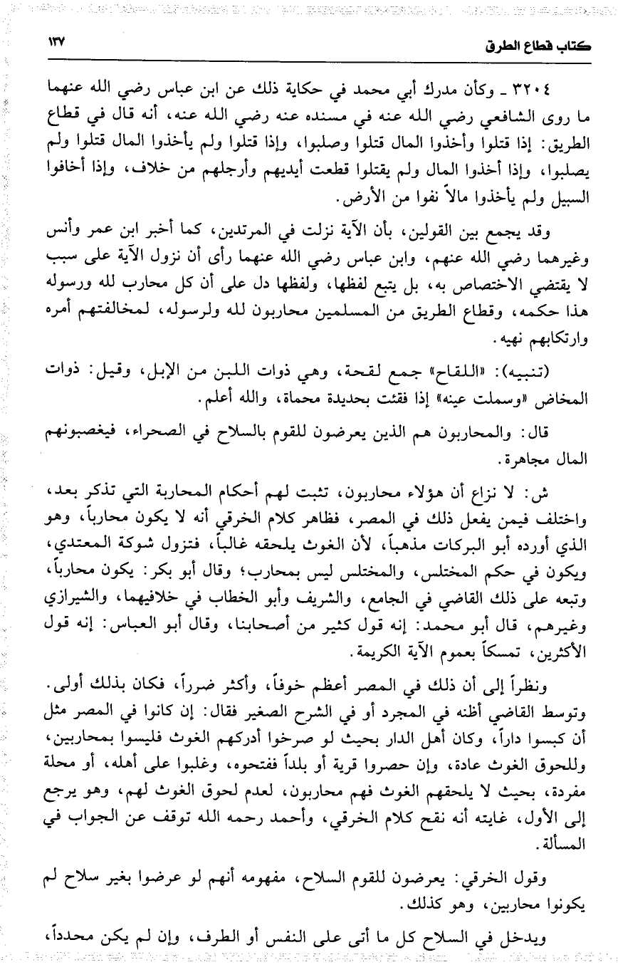 ش : لا نزاع أن هؤلاء محاربون ، تثبت لهم أحكام المحاربة التي تذكر بعد ، واختلف فيمن يفعل ذلك في المصر ، فظاهر كلام الخرقي أنه لا يكون محارباً ، وهو الذي أورده أبو البركات مذهباً ، لأن الغوث يلحقه غالباً ، فتزول شوكة المعتدي ، ويكون في حكم المختلس ، والمختلس ليس بمحارب ؛ وقال أبو بكر : يكون محارباً ، وتبعه على ذلك القاضي في الجامع ، والشريف وأبو الخطاب في خلافيهما ، والشيرازي وغيرهم ، قال أبو محمد : إنه قول كثير من أصحابنا ، وقال أبو العباس : إنه قول الأكثرين ، تمسكاً بعموم الآية الكريمة .