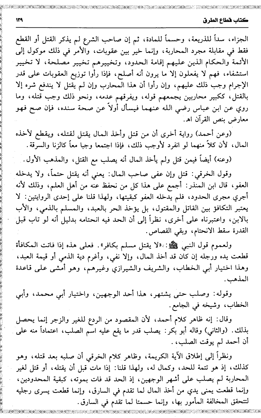 الجزاء ، سداً للذريعة ، وحسماً للمادة ، ثم إن صاحب الشرع لم يذكر القتل أو القطع فقط في مقابلة مجرد المحاربة ، وإنما خير بين عقوبات ، والأمر في ذلك موكول إلى الأئمة والحكام الذين عليهم إقامة الحدود ، وتخييرهم تخيير مصلحة ، لا تخيير استشفاء ، فهم لا يفعلون إلا ما يرون أنه أصلح ، فإذا رأوا توزيع العقوبات على قدر الإجرام وجب ذلك عليهم ، وإن رأوا أن هذا المحارب وإن لم يقتل لا يندفع شره إلا بالقتل ، ككبير محاربين يجمعهم قوله ، ويفرقهم عدمه ، ونحو ذلك وجب قتله ، وما روي عن ابن عباس رضي الله عنهما فيسأل أولاً عن صحة سنده ، فإن صح فهو معارض بنص القرآن اه .