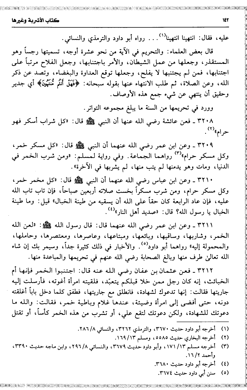 3211 وعن ابن عمر رضي الله عنهما قال : قال رسول الله : ( لعن الله الخمر ، وشاربها ، وساقيها ، وبائعها ، ومبتاعها ، وعاصرها ، ومعتصرها ، وحاملها ، والمحمولة إليه ) رواهما أبو داود . والأخبار في ذلك كثيرة جداً ، وسيمر بك إن شاء الله تعالى طرف منها وبالغ الصحابة رضي الله عنهم في تحريمها والمباعدة منها .