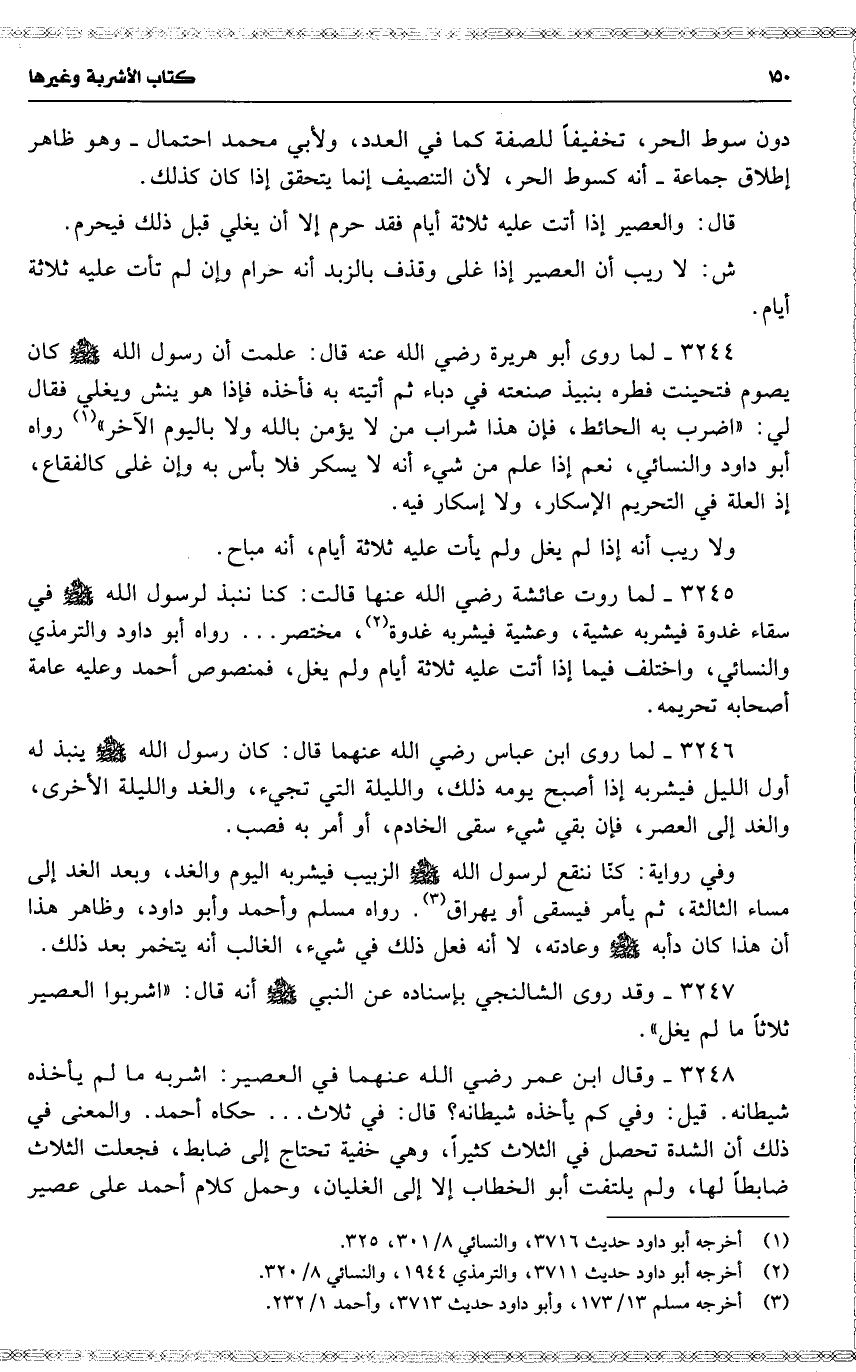 3245 لما روت عائشة رضي الله عنها قالت : كنا ننبذ لرسول الله في سقاء غدوة فيشربه عشية ، وعشية فيشربه غدوة ، مختصر . . . رواه أبو داود والترمذي والنسائي ، واختلف فيما إذا أتت عليه ثلاثة أيام ولم يغل ، فمنصوص أحمد وعليه عامة أصحابه تحريمه .