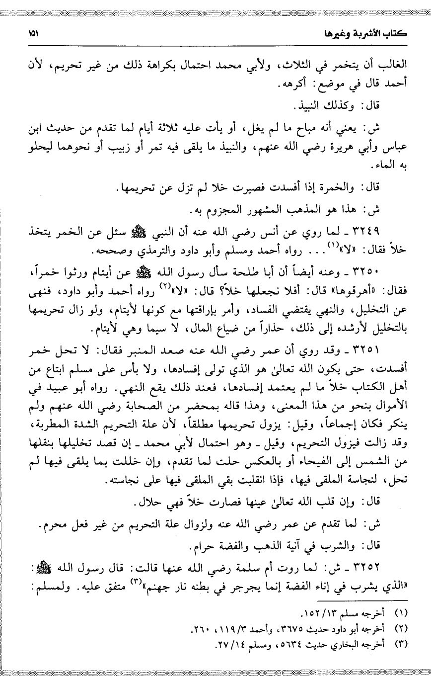 3250 وعنه أيضاً أن أبا طلحة سأل رسول الله عن أيتام ورثوا خمراً ، فقال : ( أهرقوها ) قال : أفلا نجعلها خلاً ؟ قال : ( لا ) رواه أحمد وأبو داود ، فنهى عن التخليل ، والنهي يقتضي الفساد ، وأمر بإراقتها مع كونها لأيتام ، ولو زال تحريمها بالتخليل لأرشده إلى ذلك ، حذاراً من ضياع المال ، لا سيما وهي لأيتام .