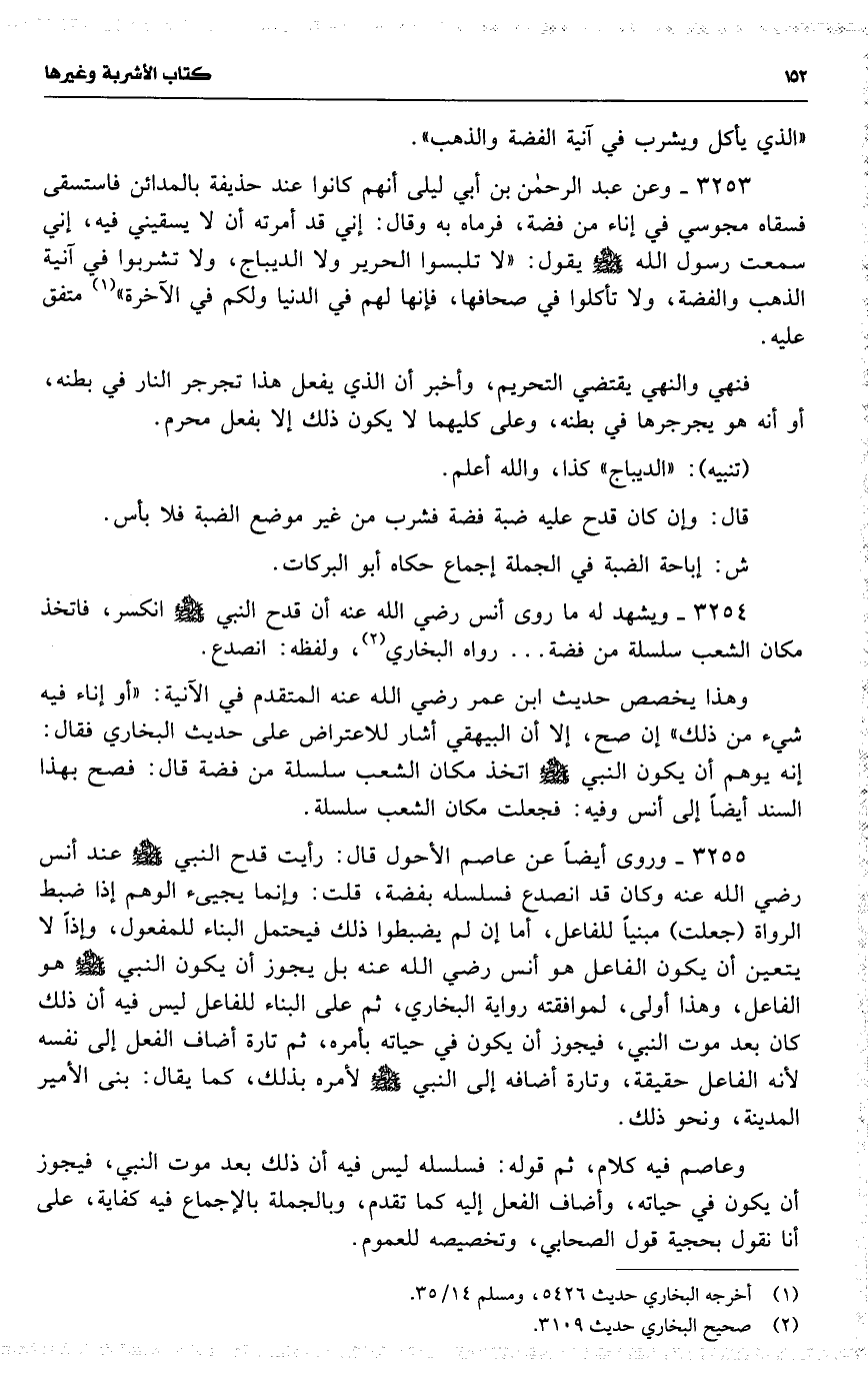 3255 وروى أيضاً عن عاصم الأحول قال : رأيت قدح النبي عند أنس رضي الله عنه وكان قد انصدع فسلسله بفضة ، قلت : وإنما يجيىء الوهم إذا ضبط الرواة ( جعلت ) مبنياً للفاعل ، أما إن لم يضبطوا ذلك فيحتمل البناء للمفعول ، وإذاً لا يتعين أن يكون الفاعل هو أنس رضي الله عنه بل يجوز أن يكون النبي هو الفاعل ، وهذا أولى ، لموافقته رواية البخاري ، ثم على البناء للفاعل ليس فيه أن ذلك كان بعد موت النبي ، فيجوز أن يكون في حياته بأمره ، ثم تارة أضاف الفعل إلى نفسه لأنه الفاعل حقيقة ، وتارة أضافه إلى النبي لأمره بذلك ، كما يقال : بنى الأمير المدينة ، ونحو ذلك .