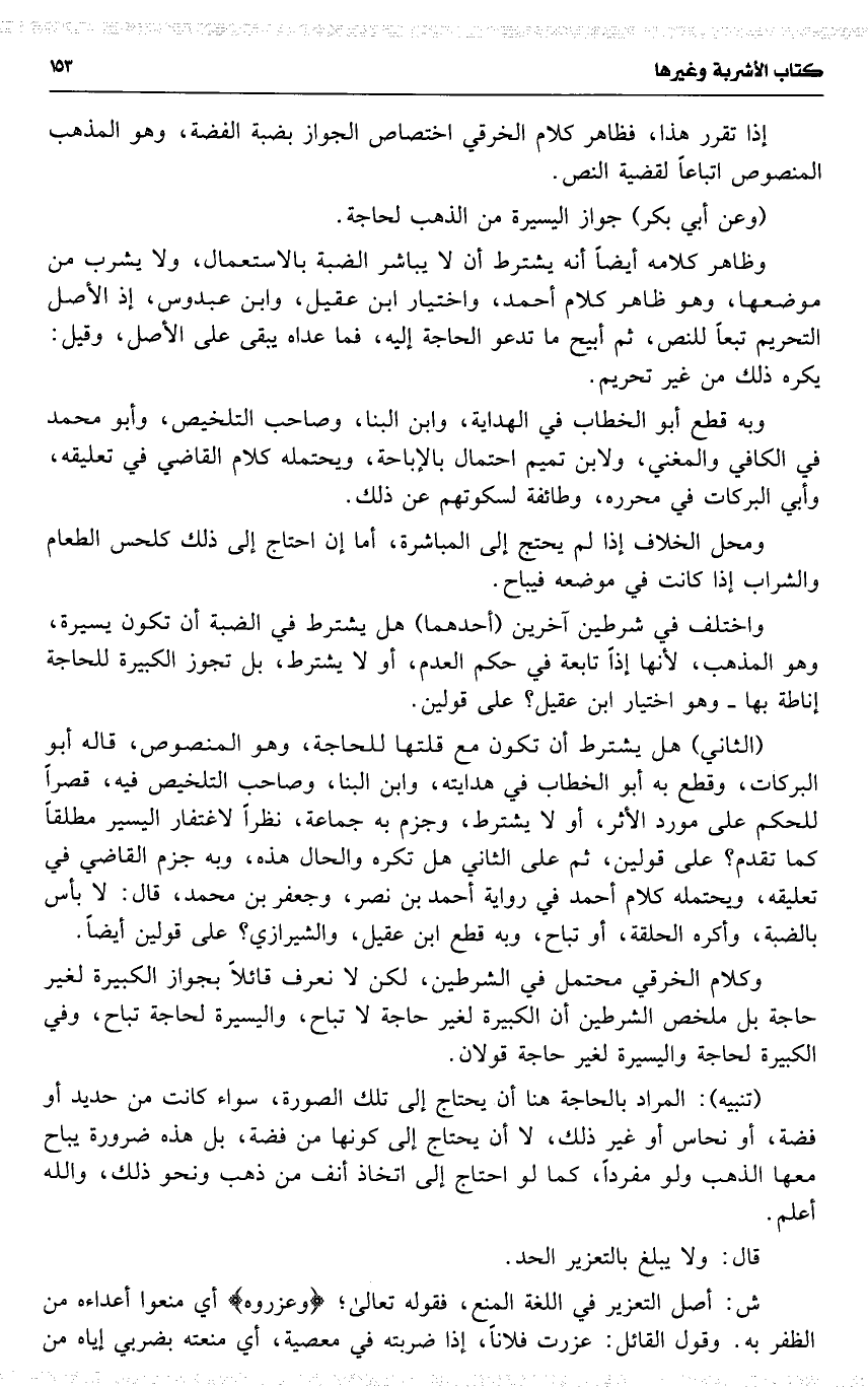 وكلام الخرقي محتمل في الشرطين ، لكن لا نعرف قائلاً بجواز الكبيرة لغير حاجة بل ملخص الشرطين أن الكبيرة لغير حاجة لا تباح ، واليسيرة لحاجة تباح ، وفي الكبيرة لحاجة واليسيرة لغير حاجة قولان .