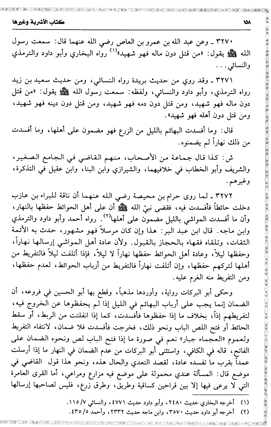 3270 وعن عبد الله بن عمرو بن العاص رضي الله عنهما قال : سمعت رسول الله يقول : ( من قتل دون ماله فهو شهيد ) رواه البخاري وأبو داود والترمذي والنسائي . . .