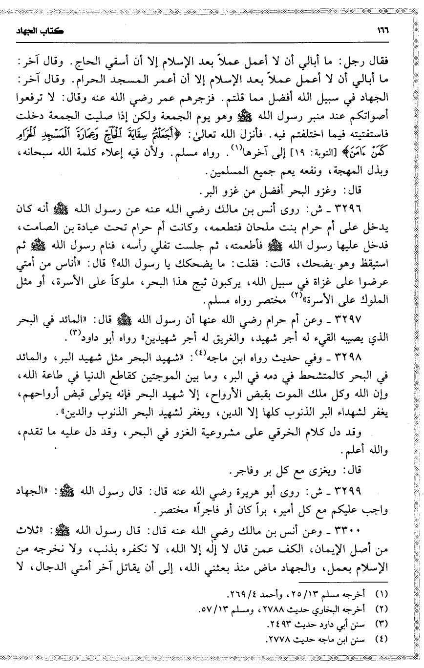 3296 ش : روى أنس بن مالك رضي الله عنه عن رسول الله أنه كان يدخل على أم حرام بنت ملحان فتطعمه ، وكانت أم حرام تحت عبادة بن الصامت ، فدخل عليها رسول الله فأطعمته ، ثم جلست تفلي رأسه ، فنام رسول الله ثم استيقظ وهو يضحك ، قالت : فقلت : ما يضحكك يا رسول الله ؟ قال : ( أناس من أمتي عرضوا على غزاة في سبيل الله ، يركبون ثبج هذا البحر ، ملوكاً على الأسرة ، أو مثل الملوك على الأسرة ) مختصر رواه مسلم .