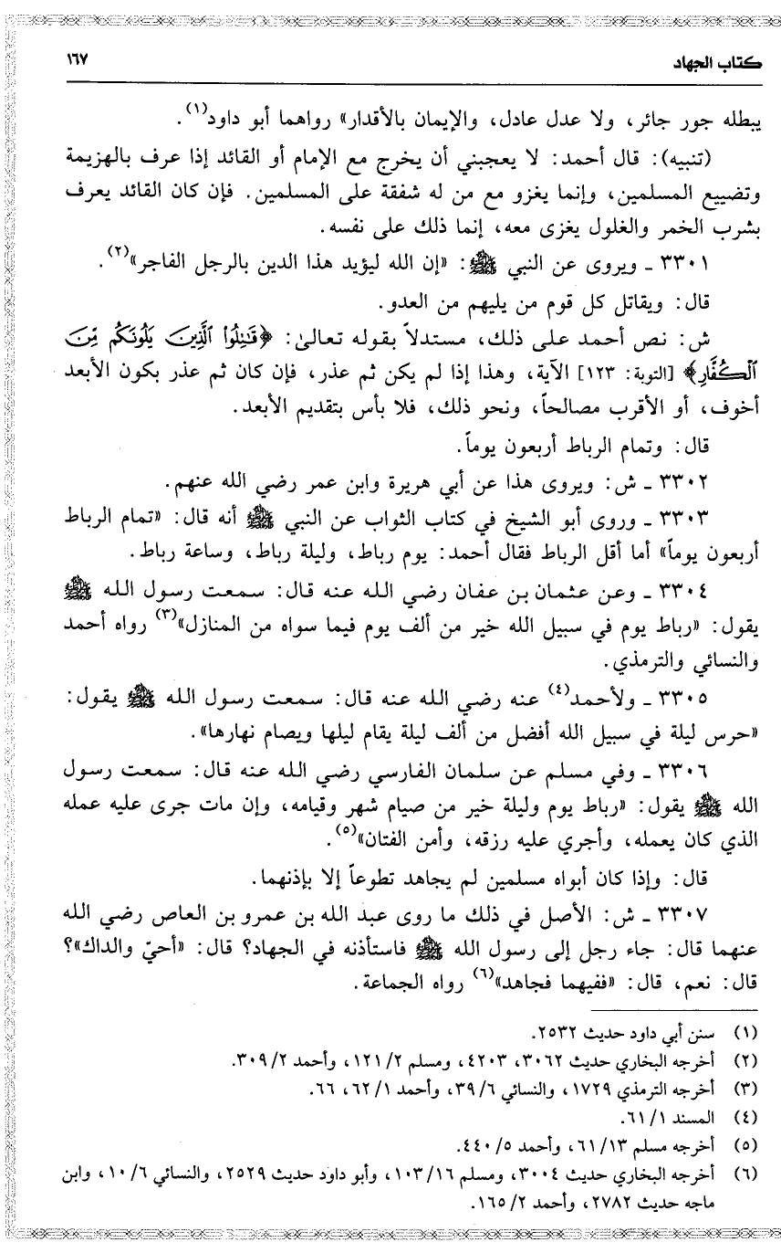 3307 ش : الأصل في ذلك ما روى عبد الله بن عمرو بن العاص رضي الله عنهما قال : جاء رجل إلى رسول الله فاستأذنه في الجهاد ؟ قال : ( أحيّ والداك ) ؟ قال : نعم ، قال : ( ففيهما فجاهد ) رواه الجاعة .
