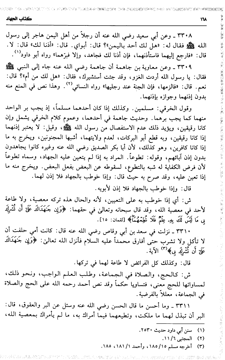 3308 وعن أبي سعيد رضي الله عنه أن رجلاً من أهل اليمن هاجر إلى رسول الله فقال له : ( هل لك أحد باليمن ) ؟ قال : أبواي . قال : ( أذنا لك ) قال : لا . قال : ( فارجع إليهما فاستأذنهما ، فإن أذنا لك فجاهد ، وإلا فبرّهما ) رواه أبو داود .