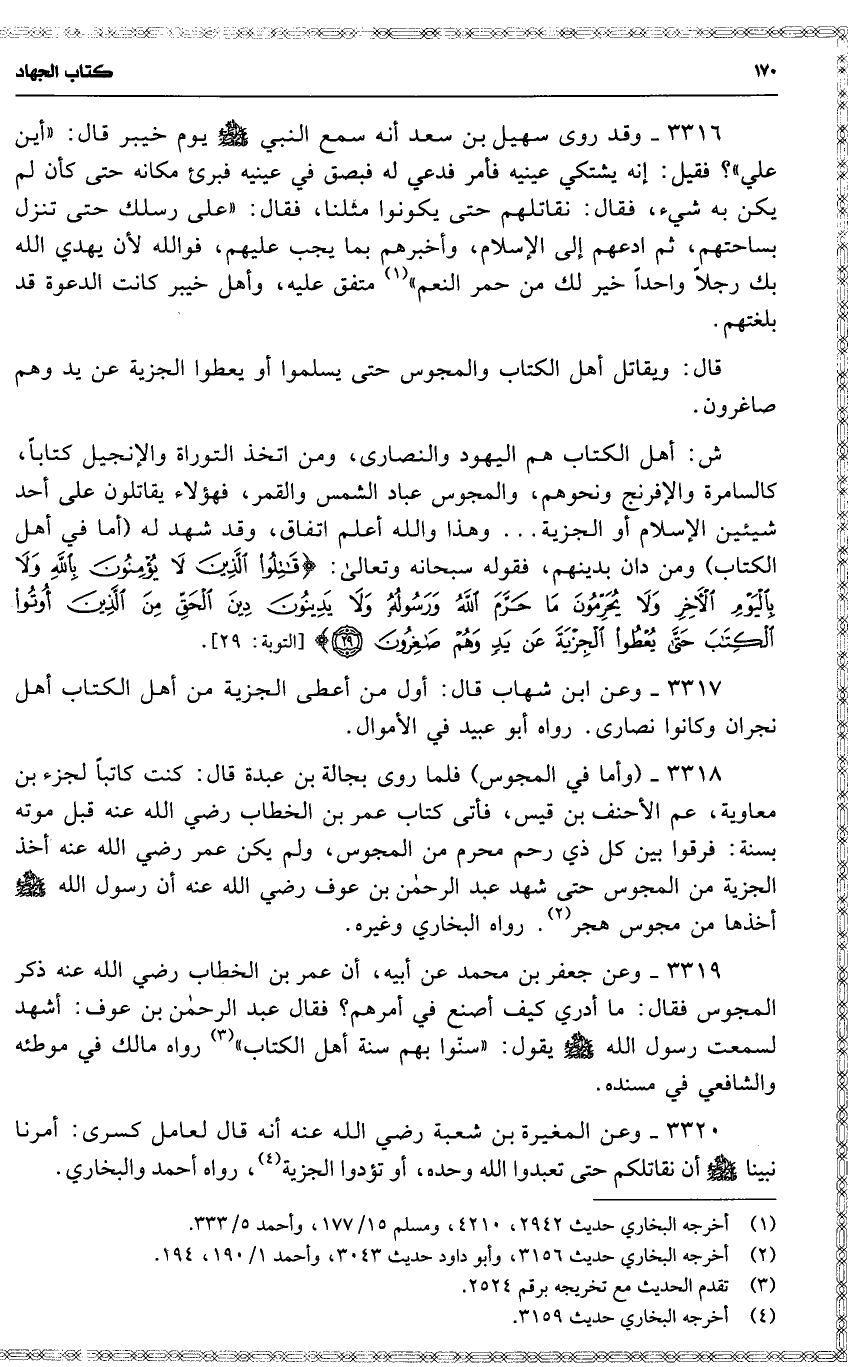 3320 وعن المغيرة بن شعبة رضي الله عنه أنه قال لعامل كسرى : أمرنا نبينا أن نقاتلكم حتى تعبدوا الله وحده ، أو تؤدوا الجزية ، رواه أحمد والبخاري .
