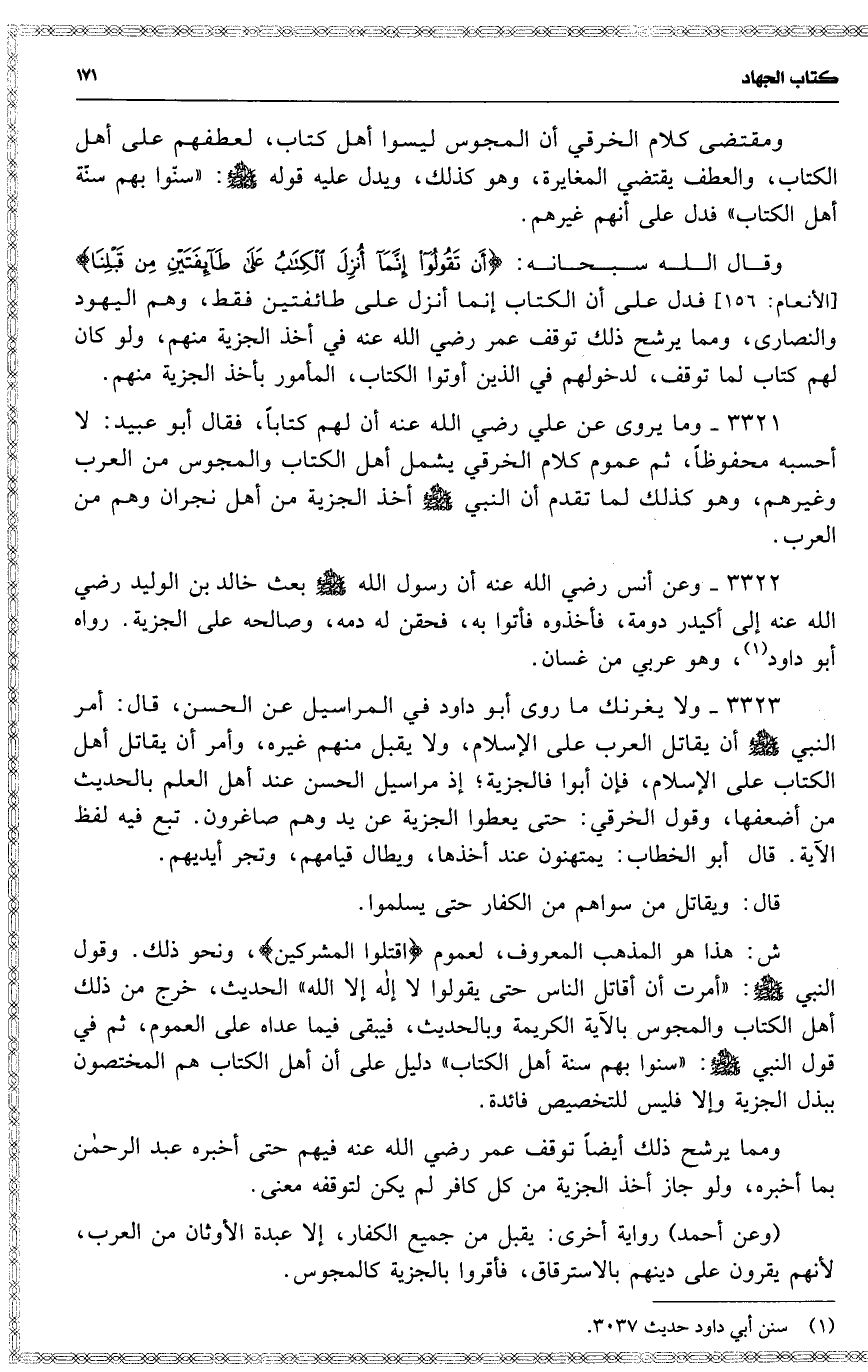 3321 وما يروى عن علي رضي الله عنه أن لهم كتاباً ، فقال أبو عبيد : لا أحسبه محفوظاً ، ثم عموم كلام الخرقي يشمل أهل الكتاب والمجوس من العرب وغيرهم ، وهو كذلك لما تقدم أن النبي أخذ الجزية من أهل نجران وهم من العرب .
