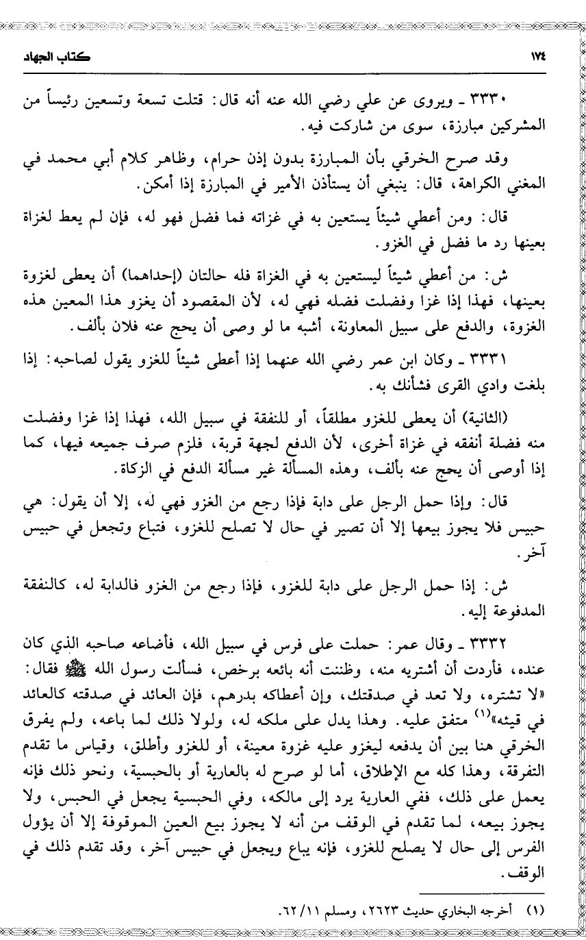 3332 وقال عمر : حملت على فرس في سبيل الله ، فأضاعه صاحبه الذي كان عنده ، فأردت أن أشتريه منه ، وظننت أنه بائعه برخص ، فسألت رسول الله فقال : ( لا تشتره ، ولا تعد في صدقتك ، وإن أعطاكه بدرهم ، فإن العائد في صدقته كالعائد في قيئه ) متفق عليه . وهذا يدل على ملكه له ، ولولا ذلك لما باعه ، ولم يفرق الخرقي هنا بين أن يدفعه ليغزو عليه غزوة معينة ، أو للغزو وأطلق ، وقياس ما تقدم التفرقة ، وهذا كله مع الإطلاق ، أما لو صرح له بالعارية أو بالحبسية ، ونحو ذلك فإنه يعمل على ذلك ، ففي العارية يرد إلى مالكه ، وفي الحبسية يجعل في الحبس ، ولا يجوز بيعه ، لما تقدم في الوقف من أنه لا يجوز بيع العين الموقوفة إلا أن يؤول الفرس إلى حال لا يصلح للغزو ، فإنه يباع ويجعل في حبيس آخر ، وقد تقدم ذلك في الوقف .