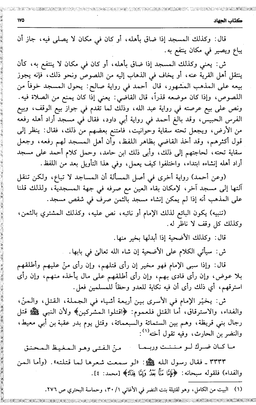 ش : يعني وكذلك المسجد إذا ضاق بأهله ، أو كان في مكان لا ينتفع به ، كأن ينتقل أهل القرية عنه ، أو يخاف في الذهاب إليه من اللصوص ونحو ذلك ، فإنه يجوز بيعه على المذهب المشهور ، قال أحمد في رواية صالح : يحول المسجد خوفاً من اللصوص ، وإذا كان موضعه قذراً ، قال القاضي : يعني إذا كان يمنع من الصلاة فيه . ونص على بيع عرصته في رواية عبد الله ، وذلك لما تقدم في جواز بيع الوقف ، وبيع الفرس الحبيس ، وقد بالغ أحمد في رواية أبي داود ، فقال في مسجد أراد أهله رفعه من الأرض ، ويجعل تحته سقاية وحوانيت ، فامتنع بعضهم من ذلك ، فقال : ينظر إلى قول أكثرهم ، وقد أخذ القاضي بظاهر اللفظ ، وأن أهل المسجد لهم رفعه ، وجعل سقاية تحته ، لحاجتهم إلى ذلك ، وأبى ذلك ابن حامد ، وحمل كلام أحمد على مسجد أراد أهله إنشاءه ابتداء ، واختلفوا كيف يعمل ، وفي هذا التأويل بعد من اللفظ .
