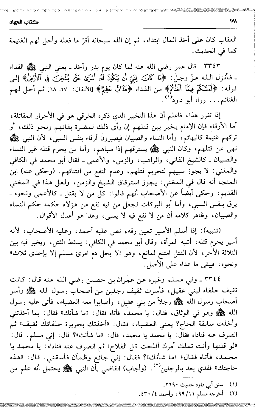 3344 وفي مسلم وغيره عن عمران بن حصين رضي الله عنه قال : كانت ثقيف حلفاء لبني عقيل ، فأسرت ثقيف رجلين من أصحاب رسول الله وأسر أصحاب رسول الله رجلاً من بني عقيل ، وأصابوا معه العضباء ، فأتى عليه رسول الله وهو في الوثاق ، فقال : يا محمد ، فأتاه فقال : ( ما شأنك ) فقال : بما أخذتني وأخذت سابقة الحاج ؟ يعني العضباء ، فقال : ( أخذتك بجريرة حلفائك ثقيف ) ثم انصرف عنه فناداه فقال : يا محمد يا محمد ، قال : ( ما شأنك ) ؟ قال : إني مسلم . قال : ( لو قلتها وأنت تملك أمرك أفلحت كل الفلاح ) ثم انصرف عنه فناداه : يا محمد يا محمد ، فأتاه فقال ؛ ( ما شأنك ) ؟ فقال : إني جائع وظمآن فأسقني . قال : ( هذه حاجتك ) ففدي بعد بالرجلين . ( وأجاب ) القاضي بأن النبي يحتمل أنه علم من
