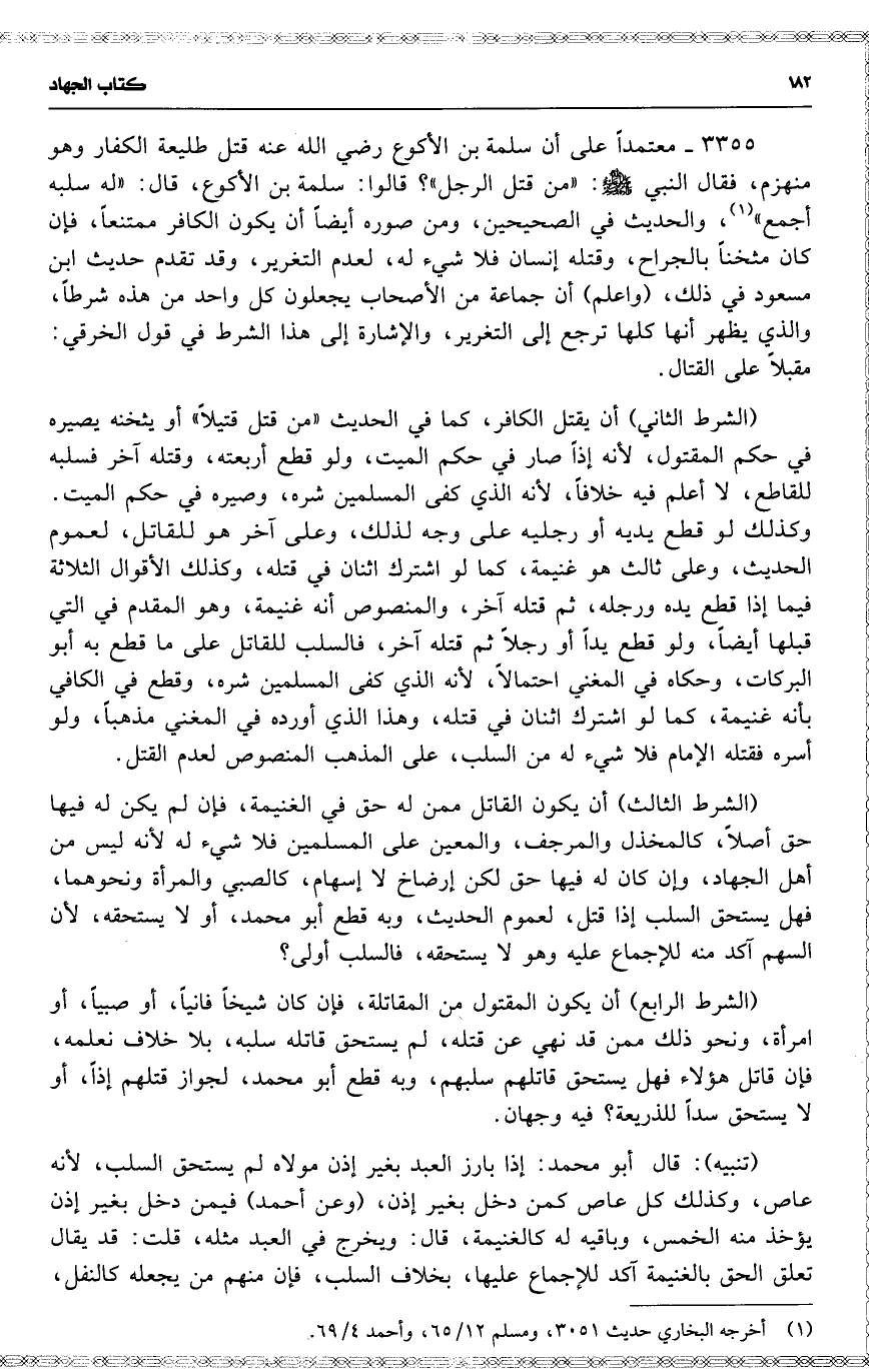 3355 معتمداً على أن سلمة بن الأكوع رضي الله عنه قتل طليعة الكفار وهو منهزم ، فقال النبي : ( من قتل الرجل ) ؟ قالوا : سلمة بن الأكوع ، قال : ( له سلبه أجمع ) ، والحديث في الصحيحين ، ومن صوره أيضاً أن يكون الكافر ممتنعاً ، فإن كان مثخناً بالجراح ، وقتله إنسان فلا شيء له ، لعدم التغرير ، وقد تقدم حديث ابن مسعود في ذلك ، ( واعلم ) أن جماعة من الأصحاب يجعلون كل واحد من هذه شرطاً ، والذي يظهر أنها كلها ترجع إلى التغرير ، والإشارة إلى هذا الشرط في قول الخرقي : مقبلاً على القتال .