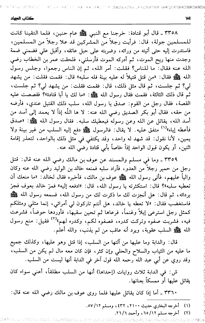3359 وما في مسلم والمسند عن عوف بن مالك رضي الله عنه قال : قتل رجل من حمير رجلاً من العدو ، فأرتد سلبه فمنعه خالد بن الوليد رضي الله عنه وكان والياً عليهم ، فأتى رسول الله عوف بن مالك ، فأخبره فقال لخالد : ( ما منعك أن تعطيه سلبه ) ؟ قال : استكثرته يا رسول الله ، قال : ( ادفعه إليه ) فمرّ خالد بعوف فجرّ بردائه ، ثم قال : هل أنجزت لك ما ذكرت لك من رسول الله ، فسمعه رسول الله فاستغضب فقال : ( لا تعطه يا خالد ، هل أنتم تاركون لي أمرائي ، إنما مثلي ومثلكم كمثل رجل استرعى إبلاً وغنماً ، فرعاها ثم تحين سقيها ، فأوردها حوضاً ، فشرعت فيه ، فشربت صفوه وتركت كدره ، فصفوه لكم ، وكدره لهم ) فقيل : منع رسول الله السلب عقوبة ، ويرد أنه عاقب من لم يذنب ، والله أعلم .
