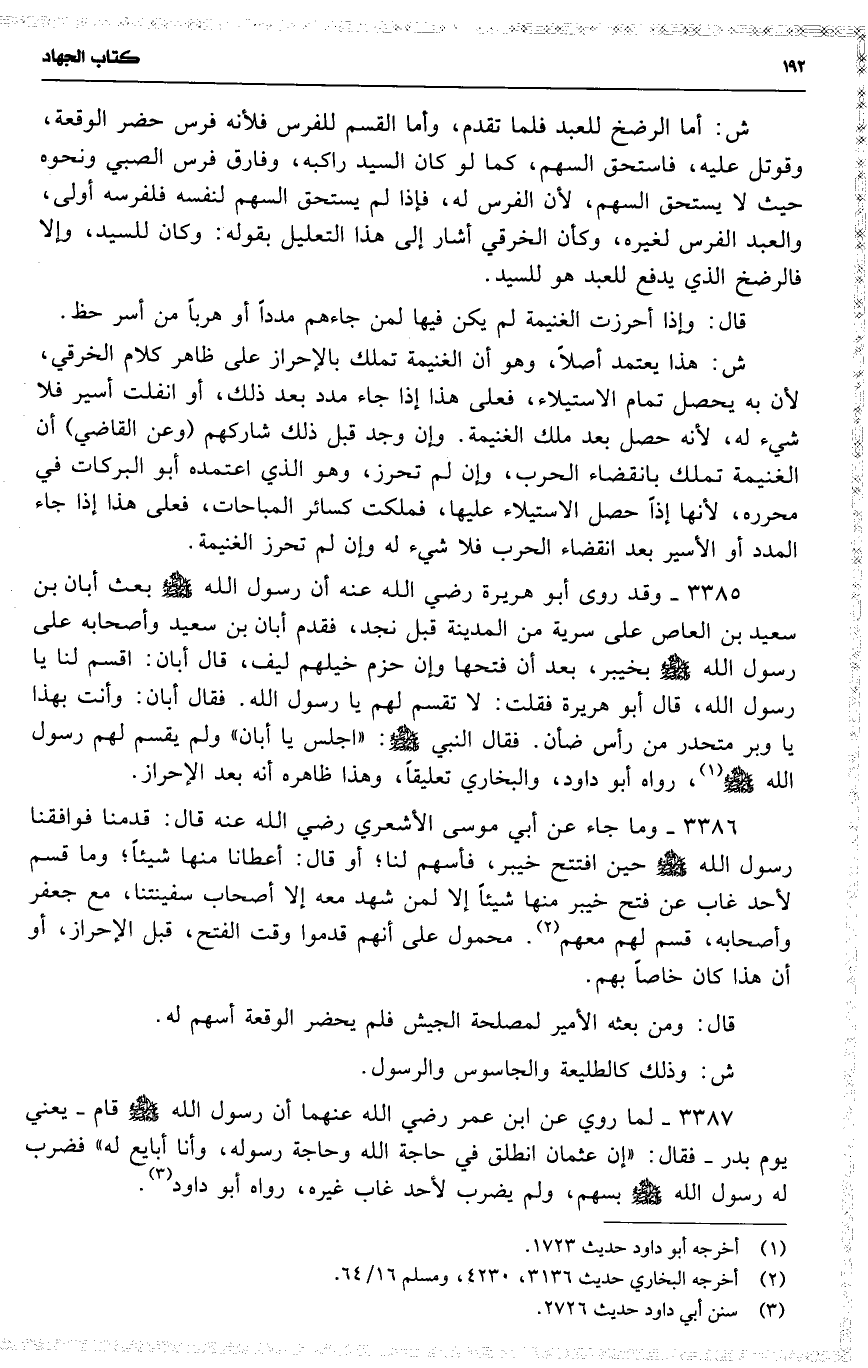 3385 وقد روى أبو هريرة رضي الله عنه أن رسول الله بعث أبان بن سعيد بن العاص على سرية من المدينة قبل نجد ، فقدم أبان بن سعيد وأصحابه على رسول الله بخيبر ، بعد أن فتحها وإن حزم خيلهم ليف ، قال أبان : اقسم لنا يا رسول الله ، قال أبو هريرة فقلت : لا تقسم لهم يا رسول الله . فقال أبان : وأنت بهذا يا وبر متحدر من رأس ضأن . فقال النبي : ( اجلس يا أبان ) ولم يقسم لهم رسول الله ، رواه أبو داود ، والبخاري تعليقاً ، وهذا ظاهره أنه بعد الإحراز .