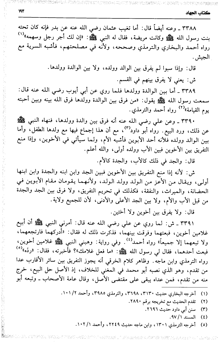 3391 ش : لما روي عن علي رضي الله عنه قال : أمرني النبي أن أبيع غلامين أخوين ، فبعتهما وفرقت بينهما ، فذكرت ذلك له فقال : ( أدركهما فارتجعهما ، ولا تبعهما إلا جميعاً ) رواه أحمد . وفي رواية : وهبني النبي غلامين أخوين ، فبعت أحدهما ، فقال لي رسول الله : ( ما فعل غلامك ) ؟ فأخبرته ، فقال : ( ردّه ) رواه الترمذي وابن ماجه . وظاهر كلام الخرقي أنه يجوز التفريق بين سائر الأقارب عدا من تقدم ، وهو الذي نصبه أبو محمد في المغني للخلاف ، إذ الأصل حل البيع ، خرج منه من تقدم ، فمن عداه يبقى على مقتضى الأصل ، وقال عامة الأصحاب وتبعه أبو