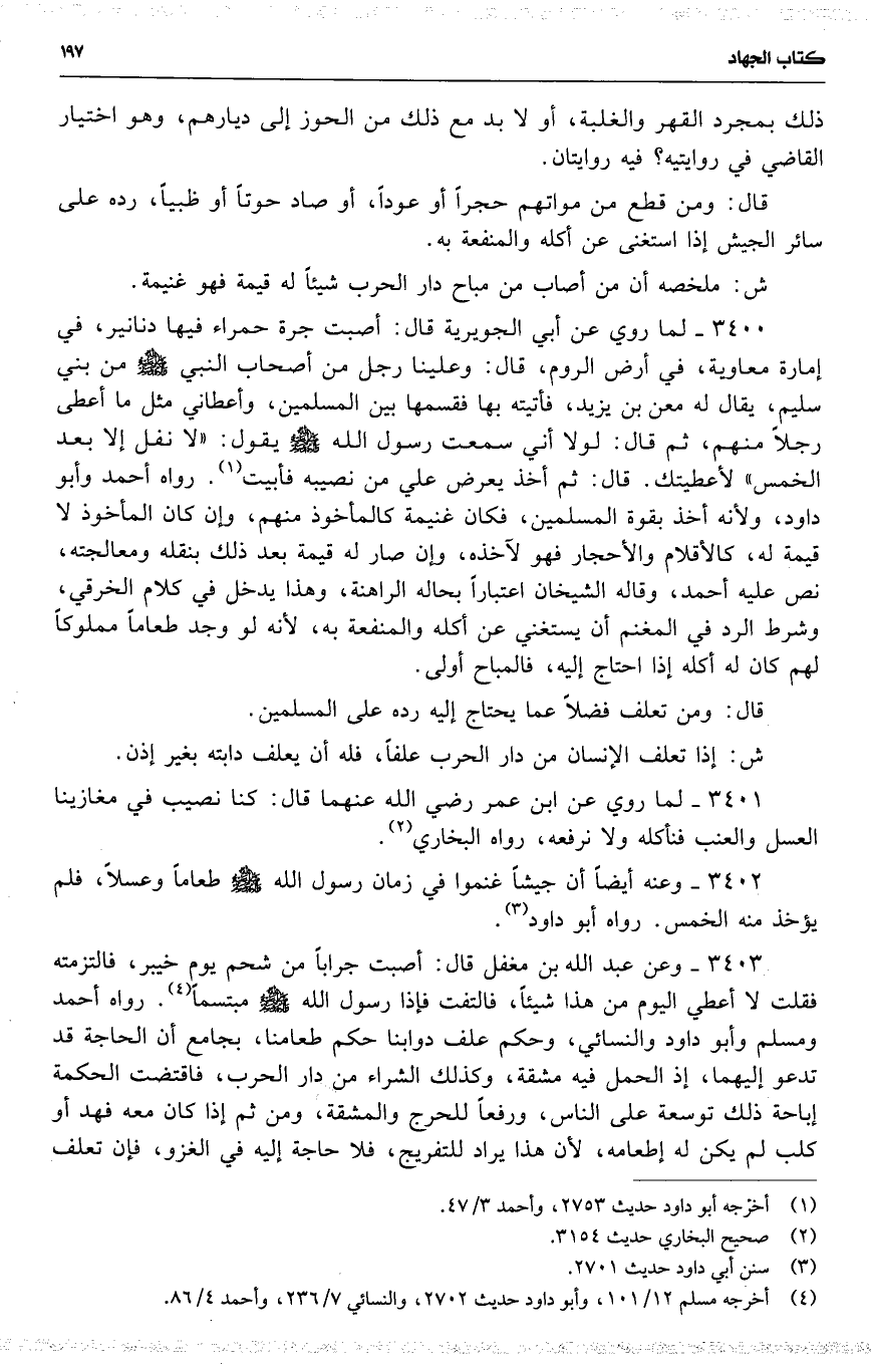 3400 لما روي عن أبي الجويرية قال : أصبت جرة حمراء فيها دنانير ، في إمارة معاوية ، في أرض الروم ، قال : وعلينا رجل من أصحاب النبي من بني سليم ، يقال له معن بن يزيد ، فأتيته بها فقسمها بين المسلمين ، وأعطاني مثل ما أعطى رجلاً منهم ، ثم قال : لولا أني سمعت رسول الله يقول : ( لا نفل إلا بعد الخمس ) لأعطيتك . قال : ثم أخذ يعرض علي من نصيبه فأبيت . رواه أحمد وأبو داود ، ولأنه أخذ بقوة المسلمين ، فكان غنيمة كالمأخوذ منهم ، وإن كان المأخوذ لا قيمة له ، كالأقلام والأحجار فهو لآخذه ، وإن صار له قيمة بعد ذلك بنقله ومعالجته ، نص عليه أحمد ، وقاله الشيخان اعتباراً بحاله الراهنة ، وهذا يدخل في كلام الخرقي ، وشرط الرد في المغنم أن يستغني عن أكله والمنفعة به ، لأنه لو وجد طعاماً مملوكاً لهم كان له أكله إذا احتاج إليه ، فالمباح أولى .