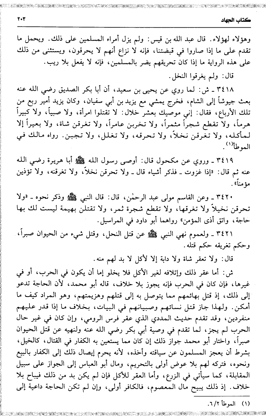 3418 ش : لما روي عن يحيى بن سعيد ، أن أبا بكر الصديق رضي الله عنه بعث جيوشاً إلى الشام ، فخرج يمشي مع يزيد بن أبي سفيان ، وكان يزيد أمير ربع من تلك الأرباع ، فقال : إني موصيك بعشر خلال : لا تقتلوا امرأة ، ولا صبياً ، ولا كبيراً هرماً ، ولا تقطع شجراً مثمراً ، ولا تخربن عامراً ، ولا تغرقن شاة ، ولا بعيراً إلا لمأكله ، ولا تغرقن نخلاً ، ولا تحرقه ، ولا تغلل ، ولا تجبن . رواه مالك في الموطأ .