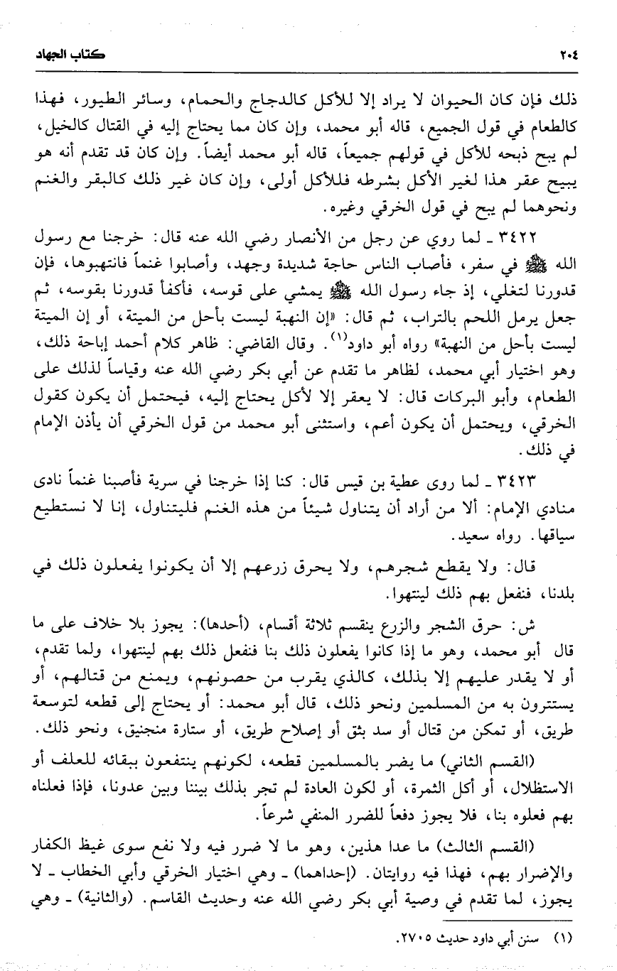 3422 لما روي عن رجل من الأنصار رضي الله عنه قال : خرجنا مع رسول الله في سفر ، فأصاب الناس حاجة شديدة وجهد ، وأصابوا غنماً فانتهبوها ، فإن قدورنا لتغلي ، إذ جاء رسول الله يمشي على قوسه ، فأكفأ قدورنا بقوسه ، ثم جعل يرمل اللحم بالتراب ، ثم قال : ( إن النهبة ليست بأحل من الميتة ، أو إن الميتة ليست بأحل من النهبة ) رواه أبو داود . وقال القاضي : ظاهر كلام أحمد إباحة ذلك ، وهو اختيار أبي محمد ، لظاهر ما تقدم عن أبي بكر رضي الله عنه وقياساً لذلك على الطعام ، و أبو البركات قال : لا يعقر إلا لأكل يحتاج إليه ، فيحتمل أن يكون كقول الخرقي ، ويحتمل أن يكون أعم ، واستثنى أبو محمد من قول الخرقي أن يأذن الإمام في ذلك .