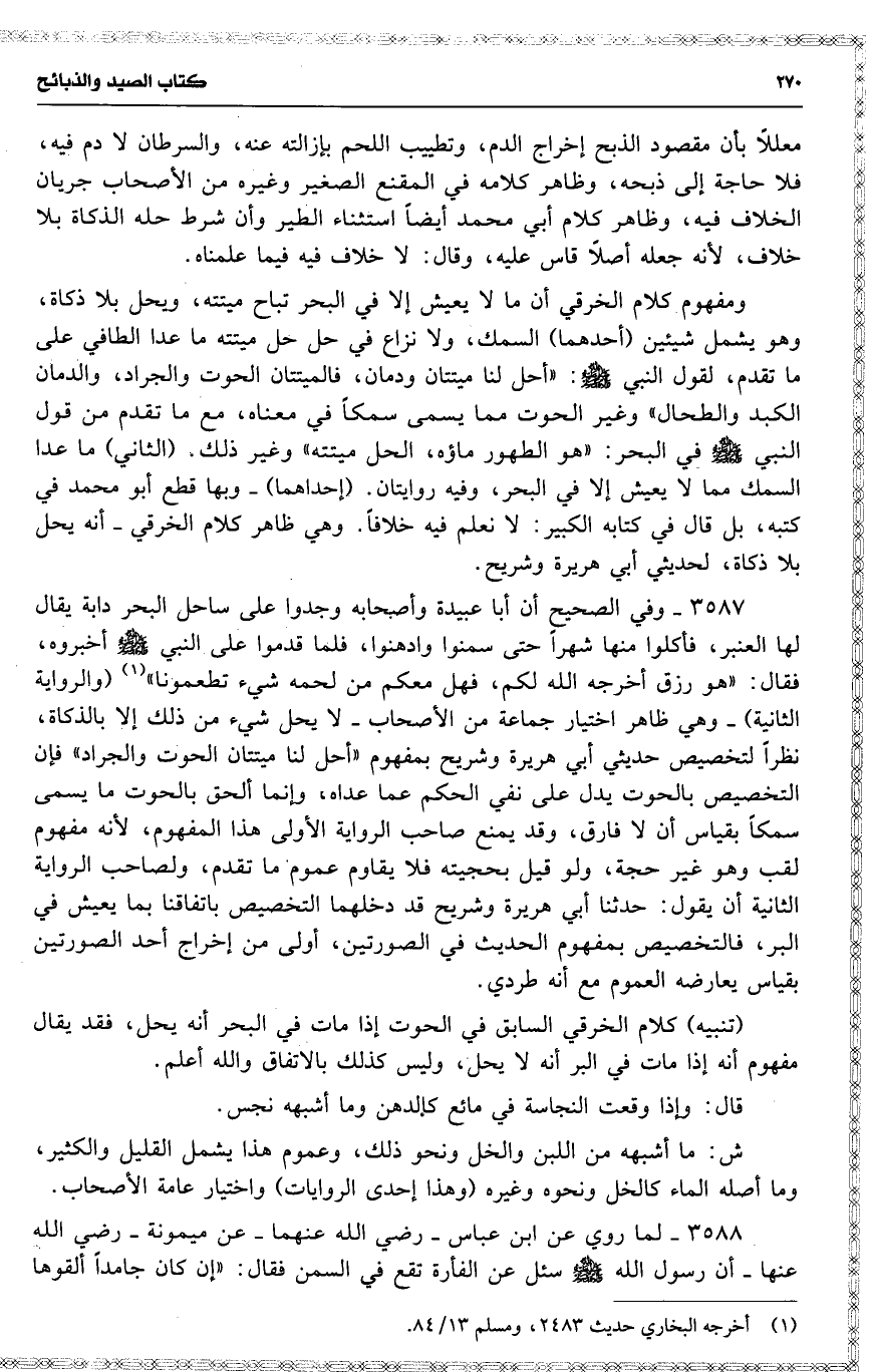 ومفهوم كلام الخرقي أن ما لا يعيش إلا في البحر تباح ميتته ، ويحل بلا ذكاة ، وهو يشمل شيئين ( أحدهما ) السمك ، ولا نزاع في حل حل ميتته ما عدا الطافي على ما تقدم ، لقول النبي : ( أحل لنا ميتتان ودمان ، فالميتتان الحوت والجراد ، والدمان الكبد والطحال ) وغير الحوت مما يسمى سمكاً في معناه ، مع ما تقدم من قول النبي في البحر : ( هو الطهور ماؤه ، الحل ميتته ) وغير ذلك . ( الثاني ) ما عدا السمك مما لا يعيش إلا في البحر ، وفيه روايتان . ( إحداهما ) وبها قطع أبو محمد في كتبه ، بل قال في كتابه الكبير : لا نعلم فيه خلافاً . وهي ظاهر كلام الخرقي أنه يحل بلا ذكاة ، لحديثي أبي هريرة وشريح .