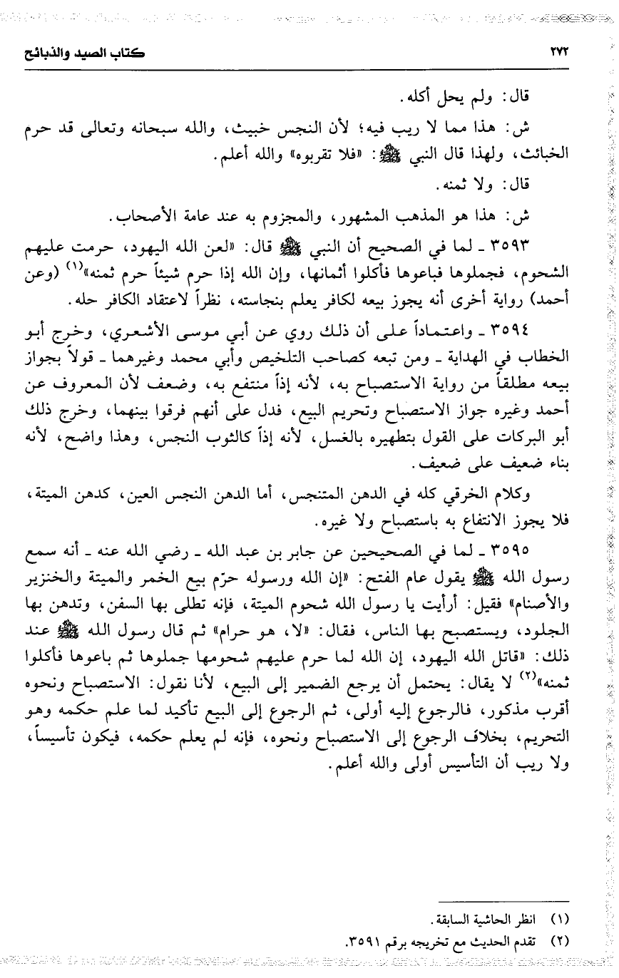 3595 لما في الصحيحين عن جابر بن عبد الله رضي الله عنه أنه سمع رسول الله يقول عام الفتح : ( إن الله ورسوله حرّم بيع الخمر والميتة والخنزير والأصنام ) فقيل : أرأيت يا رسول الله شحوم الميتة ، فإنه تطلى بها السفن ، وتدهن بها الجلود ، ويستصبح بها الناس ، فقال : ( لا ، هو حرام ) ثم قال رسول الله عند ذلك : ( قاتل الله اليهود ، إن الله لما حرم عليهم شحومها جملوها ثم باعوها فأكلوا ثمنه ) لا يقال : يحتمل أن يرجع الضمير إلى البيع ، لأنا نقول : الاستصباح ونحوه أقرب مذكور ، فالرجوع إليه أولى ، ثم الرجوع إلى البيع تأكيد لما علم حكمه وهو التحريم ، بخلاف الرجوع إلى الاستصباح ونحوه ، فإنه لم يعلم حكمه ، فيكون تأسيساً ، ولا ريب أن التأسيس أولى والله أعلم .