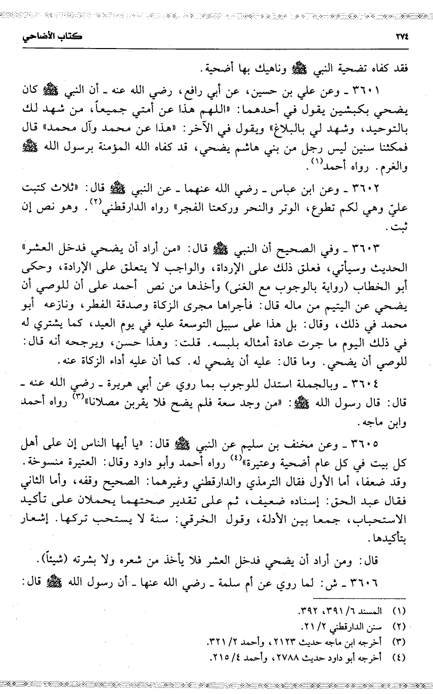 3605 وعن مخنف بن سليم عن النبي قال : ( يا أيها الناس إن على أهل كل بيت في كل عام أضحية وعتيرة ) رواه أحمد وأبو داود وقال : العتيرة منسوخة . وقد ضعفا ، أما الأول فقال الترمذي والدارقطني وغيرهما : الصحيح وقفه ، وأما الثاني فقال عبد الحق : إسناده ضعيف ، ثم على تقدير صحتهما يحملان على تأكيد الاستحباب ، جمعا بين الأدلة ، وقول الخرقي : سنة لا يستحب تركها . إشعار بتأكيدها .
