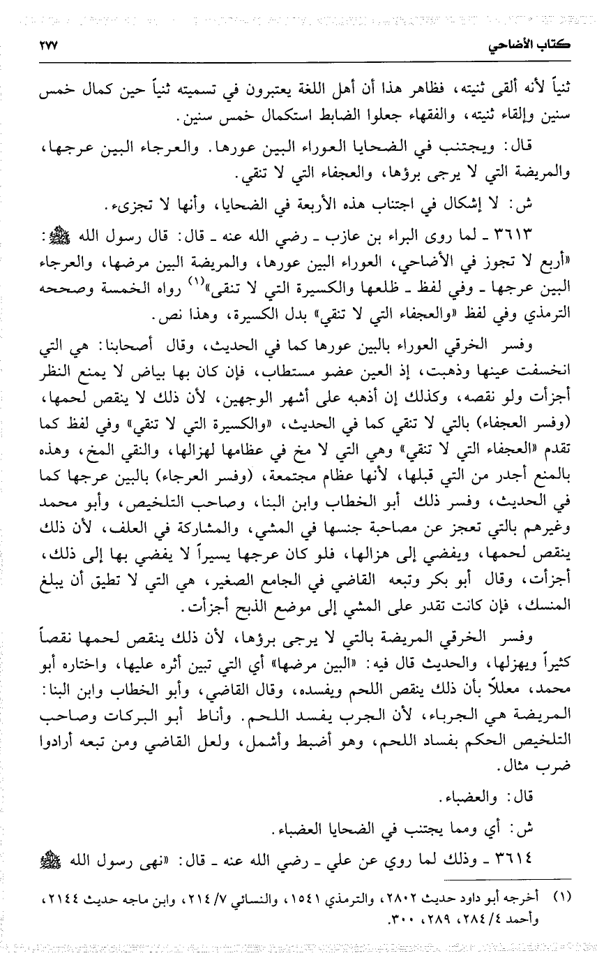 3613 لما روى البراء بن عازب رضي الله عنه قال : قال رسول الله : ( أربع لا تجوز في الأضاحي ، العوراء البين عورها ، والمريضة البين مرضها ، والعرجاء البين عرجها وفي لفظ ظلعها والكسيرة التي لا تنقي ) رواه الخمسة وصححه الترمذي وفي لفظ ( والعجفاء التي لا تنقي ) بدل الكسيرة ، وهذا نص .