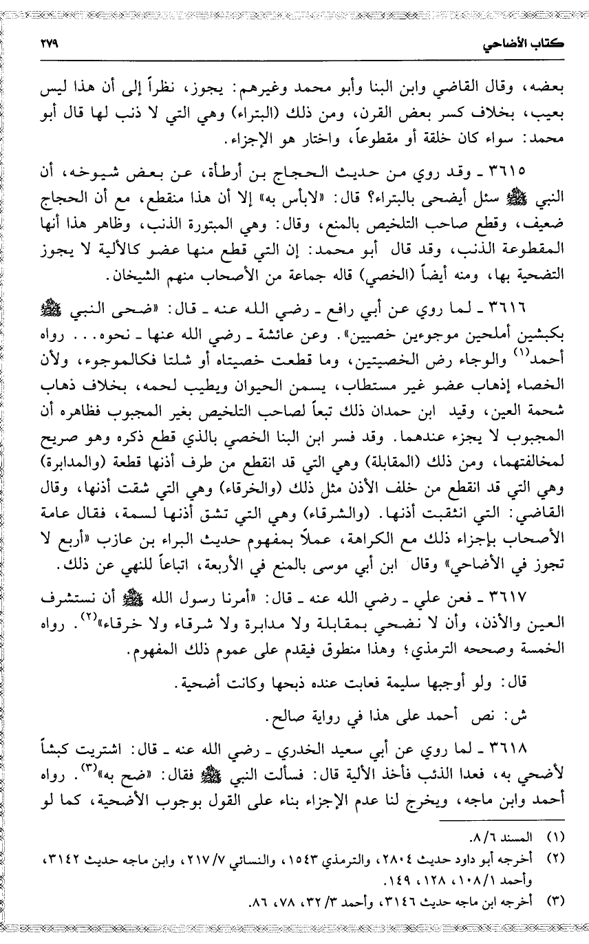 3616 لما روي عن أبي رافع رضي الله عنه قال : ( ضحى النبي بكبشين أملحين موجوءين خصيين ) . وعن عائشة رضي الله عنها نحوه . . . رواه أحمد والوجاء رض الخصيتين ، وما قطعت خصيتاه أو شلتا فكالموجوء ، ولأن الخصاء إذهاب عضو غير مستطاب ، يسمن الحيوان ويطيب لحمه ، بخلاف ذهاب شحمة العين ، وقيد ابن حمدان ذلك تبعاً لصاحب التلخيص بغير المجبوب فظاهره أن المجبوب لا يجزء عندهما . وقد فسر ابن البنا الخصي بالذي قطع ذكره وهو صريح لمخالتهما ، ومن ذلك ( المقابلة ) وهي التي قد انقطع من طرف أذنها قطعة ( والمدابرة ) وهي التي قد انقطع من خلف الأذن مثل ذلك ( والخرقاء ) وهي التي شقت أذنها ، وقال القاضي : التي انثقبت أذنها . ( والشرقاء ) وهي التي تشق أذنها لسمة ، فقال عامة الأصحاب بإجزاء ذلك مع الكراهة ، عملًا بمفهوم حديث البراء بن عازب ( أربع لا تجوز في الأضاحي ) وقال ابن أبي موسى بالمنع في الأربعة ، اتباعاً للنهي عن ذلك .