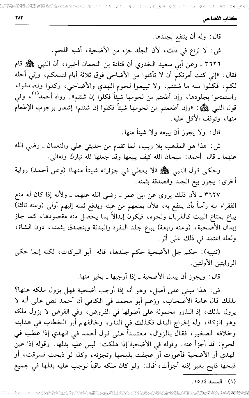 3627 لأن ذلك يروى عن ابن عمر رضي الله عنهما ولأنه إذا كان له منع الفقراء منه رأساً بأن ينتفع به ، فلأن يمنعهم من عينه ويدفع ثمنه إليهم أولى ( وعنه ثالثة ) يباع بمتاع البيت كالغربال ونحوه ، فيكون إبدالًا بما يحصل منه مقصودها ، كما جاز إبدال الأضحية ، ( وعنه رابعة ) يباع جلد البقرة والبدنة ويتصدق بثمنه ، دون الشاة ، ولعله اعتمد في ذلك على أثر .