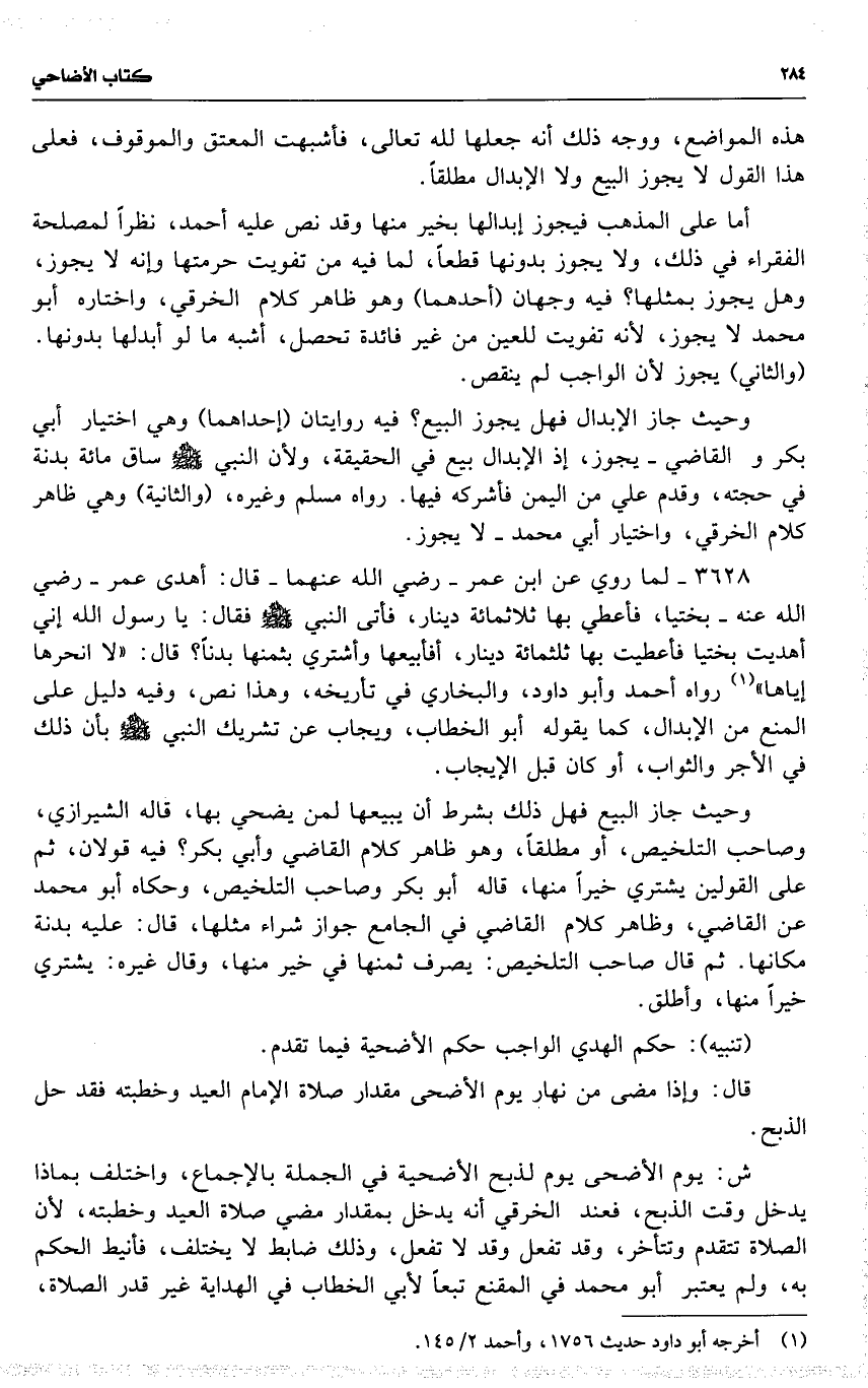 3628 لما روي عن ابن عمر رضي الله عنهما قال : أهدي عمر رضي الله عنه بختيا ، فأعطي بها ثلاثمائة دينار ، فأتى النبي فقال : يا رسول الله إني أهديت بختيا فأعطيت بها ثلثمائة دينار ، أفأبيعها وأشتري بثمنها بدناً ؟ قال : ( لا انحرها إياها ) رواه أحمد وأبو داود ، والبخاري في تأريخه ، وهذا نص ، وفيه دليل على المنع من الإبدال ، كما يقوله أبو الخطاب ، ويجاب عن تشريك النبي بأن ذلك في الأجر والثواب ، أو كان قبل الإيجاب .