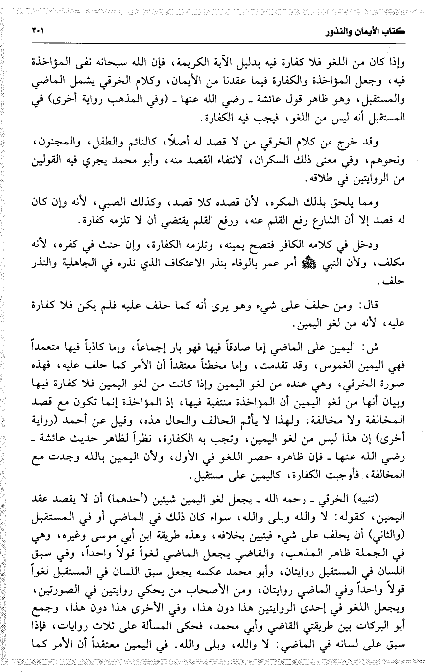 ( تنبيه ) الخرقي رحمه الله يجعل لغو اليمين شيئين ( أحدهما ) أن لا يقصد عقد اليمين ، كقوله : لا والله وبلى والله ، سواء كان ذلك في الماضي أو في المستقبل ( والثاني ) أن يحلف على شيء فيتبين بخلافه ، وهذه طريقة ابن أبي موسى وغيره ، وهي في الجملة ظاهر المذهب ، والقاضي يجعل الماضي لغواً قولًا واحداً ، وفي سبق اللسان في المستقبل روايتان ، وأبو محمد عكسه يجعل سبق اللسان في المستقبل لغواً قولًا واحداً وفي الماضي روايتان ، ومن الأصحاب من يحكي روايتين في الصورتين ، ويجعل اللغو في إحدى الروايتين هذا دون هذا ، وفي الأخرى هذا دون هذا ، وجمع أبو البركات بين طريقتي القاضي وأبي محمد ، فحكى المسألة على ثلاث روايات ، فإذا سبق على لسانه في الماضي : لا والله ، وبلى والله . في اليمين معتقداً أن الأمر كما
