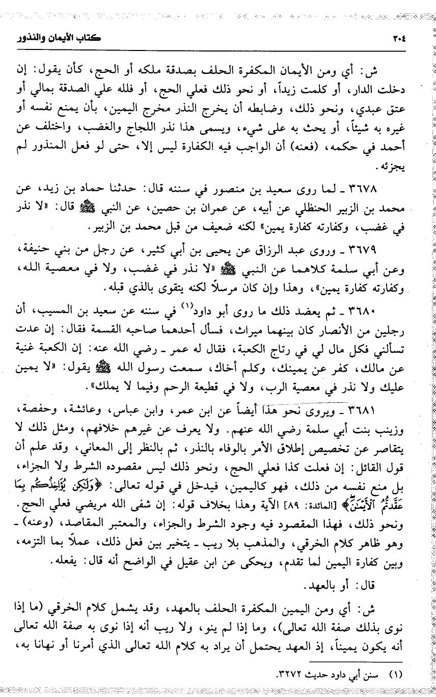 3680 ثم يعضد ذلك ما روى أبو داود في سننه عن سعيد بن المسيب ، أو رجلين من الأنصار كان بينهما ميراث ، فسأل أحدهما صاحبه القسمة فقال : إن عدت تسألني فكل مال لي في رتاج الكعبة ، فقال له عمر رضي الله عنه : إن الكعبة غنية عن مالك ، كفر عن يمينك ، وكلم أخاك ، سمعت رسول الله يقول : ( لا يمين عليك ولا نذر في معصية الرب ، ولا في قطيعة الرحم وفيما لا يملك ) .