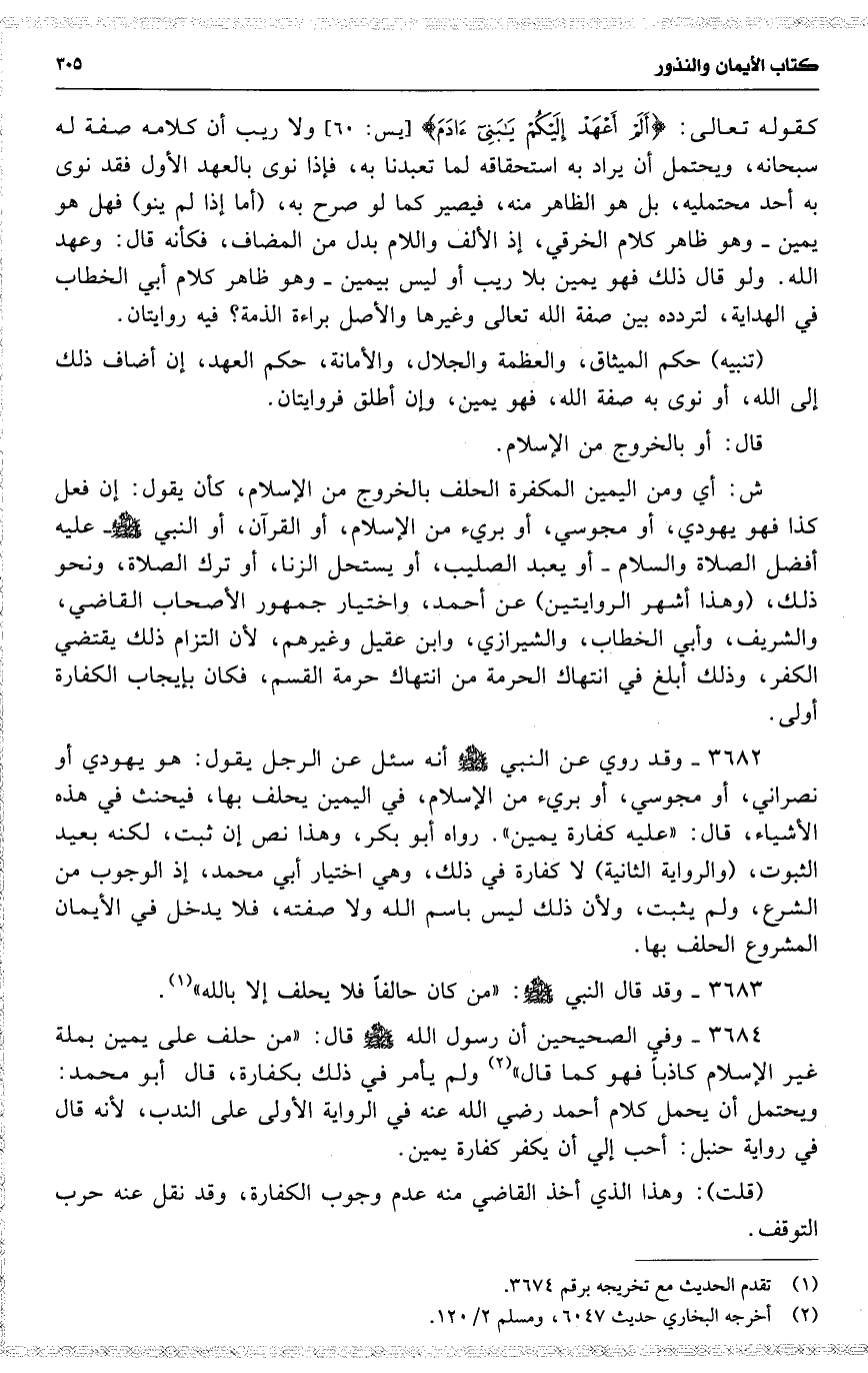 ش : أي ومن اليمين المكفرة الحلف بالخروج من الإسلام ، كأن يقول : إن فعل كذا فهو يهودي ، أو مجوسي ، أو بريء من الإسلام ، أو القرآن ، أو النبي عليه أفضل الصلاة والسلام أو يعبد الصليب ، أو يستحل الزنا ، أو ترك الصلاة ، ونحو ذلك ، ( وهذا أشهر الروايتين ) عن أحمد ، واختيار جمهور الأصحاب القاضي ، والشريف ، وأبي الخطاب ، والشيرازي ، وابن عقيل وغيرهم ، لأن التزام ذلك يقتضي الكفر ، وذلك أبلغ في انتهاك الحرمة من انتهاك حرمة القسم ، فكان بإيجاب الكفارة أولى .