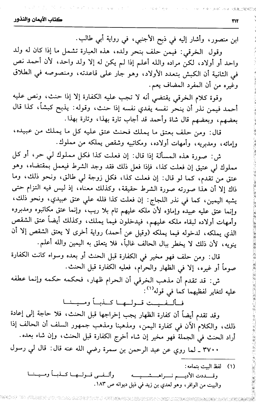 وقول الخرقي : فيمن حلف بنحر ولده ، هذه العبارة تشمل ما إذا كان له ولد واحد أو أولاد ، لكن مراده والله أعلم إذا لم يكن له إلا ولد واحد ، لأن أحمد نص في الثانية أن الكبش بتعدد الأولاد ، وهو جار على قاعدته ، ومنصوصه في الطلاق وغيره من أن المفرد المضاف يعم .