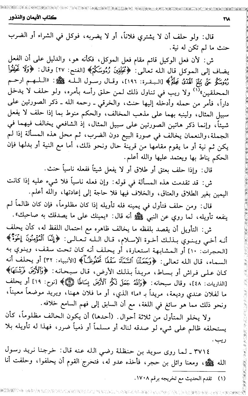 ش : التأويل أن يقصد بلفظه ما يخالف ظاهره مع احتمال اللفظ له ، كأن يحلف أنه أخي وينوي بذلك أخوة الإسلام ، قال الله تعالى : 19 ( { إنما المؤمنون إخوة } ) أو المشابهة استعارة ، أو يحلف أنه كان تحت سقف ، وينوي به السماء ، قال الله تعالى : 19 ( { وجعلنا السماء سقفا محفوظا } ) أو يحلف أنه كان على فراش أو بساط ، مريداً بذلك الأرض ، قال سبحانه : 19 ( { والأرض فرشناها } ) وقال سبحانه : 19 ( { والله جعل لكم الأرض بساطا } ) أو يحلف ما لفلان عندي وديعة ، مريداً ب ( ما ) الذي ، أو ما فلان ههنا ، ويريد موضعاً معيناً ، ونحو ذلك مما هو سائغ في اللغة ، مع أن السابق إلى فهم السامع خلافه .