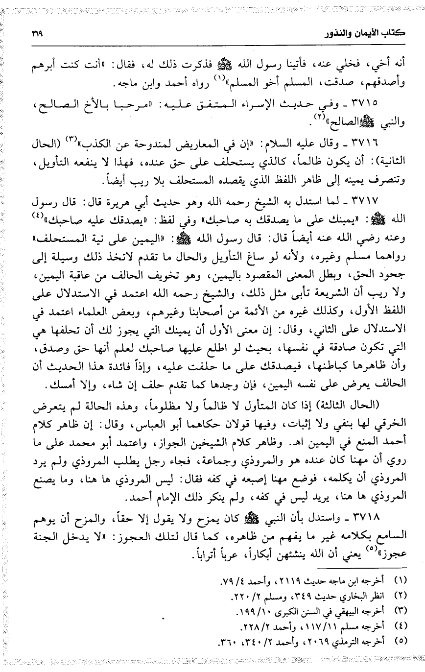 3717 لما استدل به الشيخ رحمه الله وهو حديث أبي هريرة قال : قال رسول الله : ( يمينك على ما يصدقك به صاحبك ) وفي لفظ : ( يصدقك عليه صاحبك ) وعنه رضي الله عنه أيضاً قال : قال رسول الله : ( اليمين على نية المستحلف ) رواهما مسلم وغيره ، ولأنه لو ساغ التأويل والحال ما تقدم لاتخذ ذلك وسيلة إلى جحود الحق ، وبطل المعنى المقصود باليمين ، وهو تخويف الحالف من عاقبة اليمين ، ولا ريب أن الشريعة تأبى مثل ذلك ، والشيخ رحمه الله اعتمد في الاستدلال على اللفظ الأول ، وكذلك غيره من الأئمة من أصحابنا وغيرهم ، وبعض العلماء اعتمد في الاستدلال على الثاني ، وقال : إن معنى الأول أن يمينك التي يجوز لك أن تحلفها هي التي تكون صادقة في نفسها ، بحيث لو اطلع عليها صاحبك لعلم أنها حق وصدق ، وأن ظاهرها كباطنها ، فيصدقك على ما حلفت عليه ، وإذاً فائدة هذا الحديث أن الحالف يعرض على نفسه اليمين ، فإن وجدها كما تقدم حلف إن شاء ، وإلا أمسك .