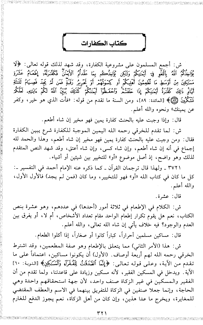 ش : أجمع المسلمون على مشروعية الكفارة ، وقد شهد لذلك قوله تعالى : 19 ( { لا يؤاخذكم الله باللغو في أيمانكم ، ولكن يؤاخذكم بما عقدتم الأيمان ، فكفارته إطعام عشرة مساكين من أوسط ما تطعمون أهليكم ، أو كسوتهم ، أو تحرير رقبة ، فمن لم يجد فصيام ثلاثة أيام ، ذلك كفارة أيمانكم إذا حلفتم ، واحفظوا أيمانكم ، كذلك يبين الله لكم آياته لعلكم تشكرون } ) ، ومن السنة ما تقدم من قوله : ( فأت الذي هو خير ، وكفر عن يمينك ) ونحوه والله أعلم .