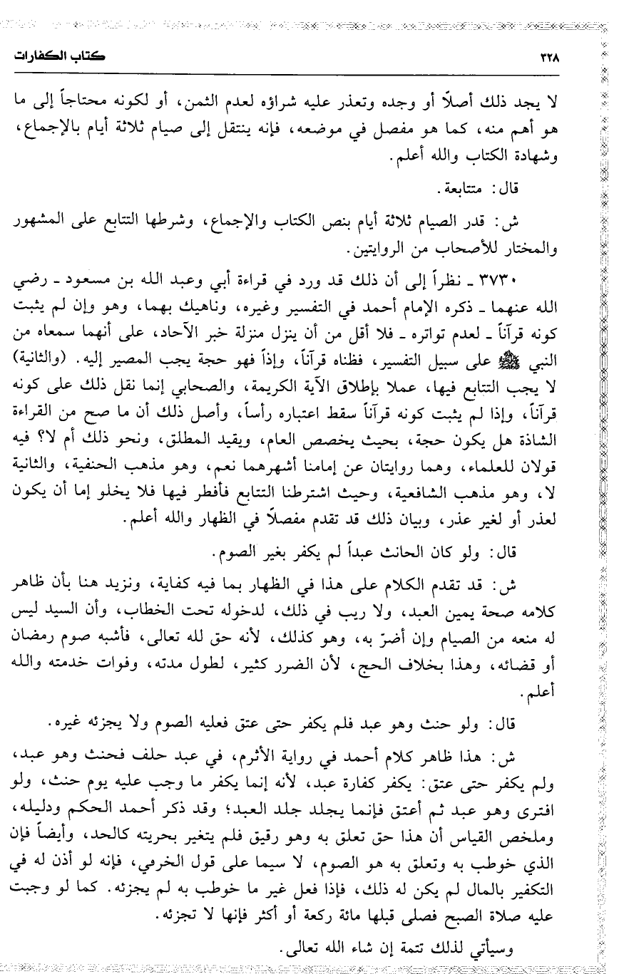 3730 نظراً إلى أن ذلك قد ورد في قراءة أبي وعبد الله بن مسعود رضي الله عنهما ذكره الإمام أحمد في التفسير وغيره ، وناهيك بهما ، وهو وإن لم يثبت كونه قرآناً لعدم تواتره فلا أقل من أن ينزل منزلة خبر الآحاد ، على أنهما سمعاه من النبي على سبيل التفسير ، فظناه قرآناً ، وإذاً فهو حجة يجب المصير إليه . ( والثانية ) لا يجب التتابع فيها ، عملا بإطلاق الآية الكريمة ، والصحابي إنما نقل اذلك على كونه قرآناً ، وإذا لم يثبت كونه قرآناً سقط اعتباره رأساً ، وأصل ذلك أن ما صح من القراءة الشاذة هل يكون حجة ، بحيث يخصص العام ، ويقيد المطلق ، ونحو ذلك أم لا ؟ فيه قولان للعلماء ، وهما روايتان عن إمامنا أشهرهما نعم ، وهو مذهب الحنفية ، والثانية لا ، وهو مذهب الشافعية ، وحيث اشترطنا التتابع فأفطر فيها فلا يخلو إما أن يكون لعذر أو لغير عذر ، وبيان ذلك قد تقدم مفصلًا في الظهار والله أعلم .