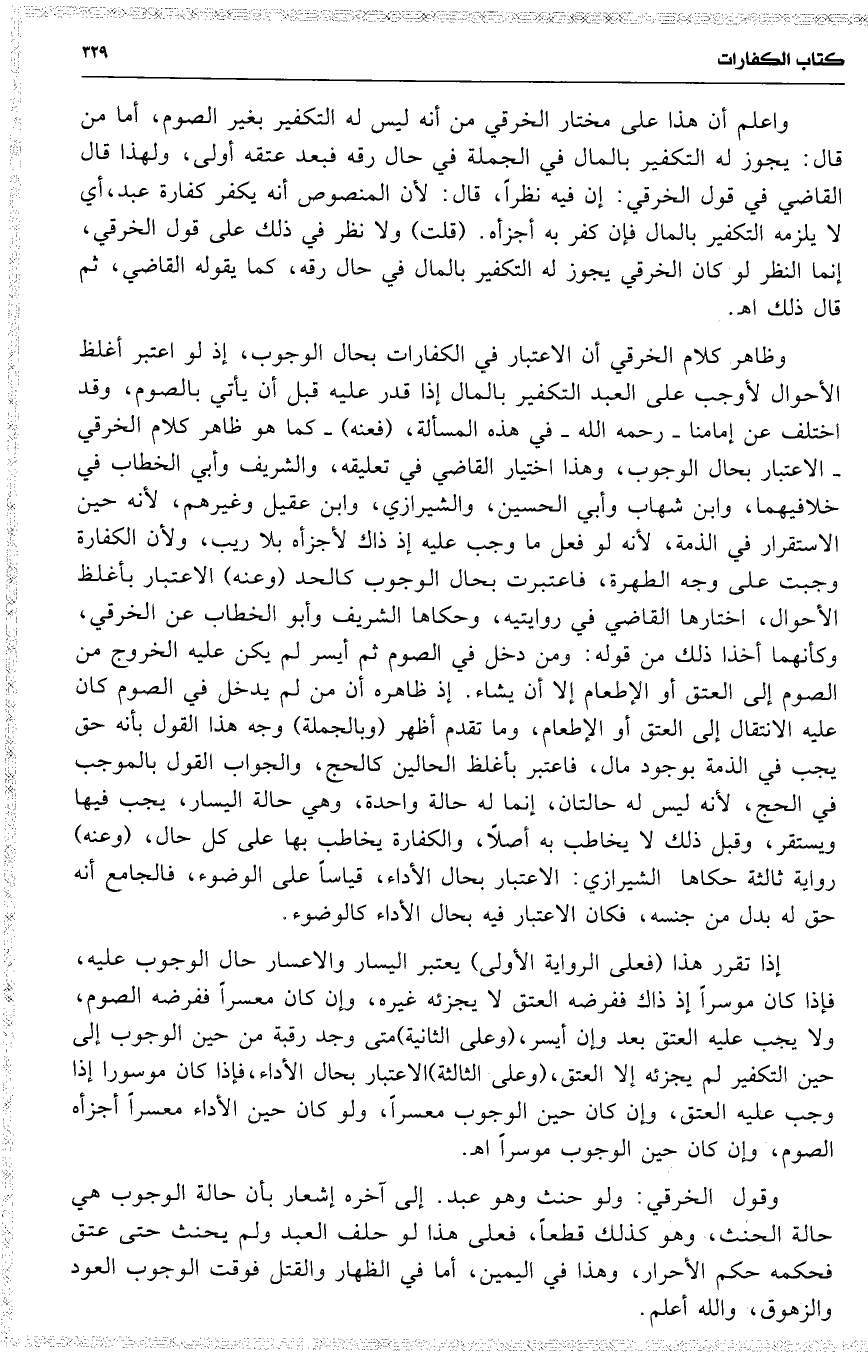 وظاهر كلام الخرقي أن الاعتبار في الكفارات بحال الوجوب ، إذ لو اعتبر أغلظ الأحوال لأوجب على العبد التكفير بالمال إذا قدر عليه قبل أن يأتي بالصوم ، وقد اختلف عن إمامنا رحمه الله في هذه المسألة ، ( فعنه ) كما هو ظاهر كلام الخرقي الاعتبار بحال الوجوب ، وهذا اختيار القاضي في تعليقه ، والشريف وأبي الخطاب في خلافيهما ، وابن شهاب وأبي الحسين ، والشيرازي ، وابن عقيل وغيرهم ، لأنه حين الاستقرار في الذمة ، لأنه لو فعل ما وجب عليه إذ ذاك لأجزأه بلا ريب ، ولأن الكفارة وجبت على وجه الطهرة ، فاعتبرت بحال الوجوب كالحد ( وعنه ) الاعتبار بأغلظ الأحوال ، اختارها القاضي في روايتيه ، وحكاها الشريف وأبو الخطاب عن الخرقي ، وكأنهما أخذا ذلك من قوله : ومن دخل في الصوم ثم أيسر لم يكن عليه الخروج من الصوم إلى العتق أو الإطعام إلا أن يشاء . إذ ظاهره أن من لم يدخل في الصوم كان عليه الانتقال إلى العتق أو الإطعام ، وما تقدم أظهر ( وبالجملة ) وجه هذا القول بأنه حق يجب في الذمة بوجود مال ، فاعتبر بأغلظ الحالين كالحج ، والجواب القول بالموجب في الحج ، لأنه ليس له حالتان ، إنما له حالة واحدة ، وهي حالة اليسار ، يجب فيها ويستقر ، وقبل ذلك لا يخاطب به أصلًا ، والكفارة يخاطب بها على كل حال ، ( وعنه ) رواية ثالثة حكاها الشيرازي : الاعتبار بحال الأداء ، قياساً على الوضوء ، فالجامع أنه حق له بدل من جنسه ، فكان الاعتبار فيه بحال الأداء كالوضوء .