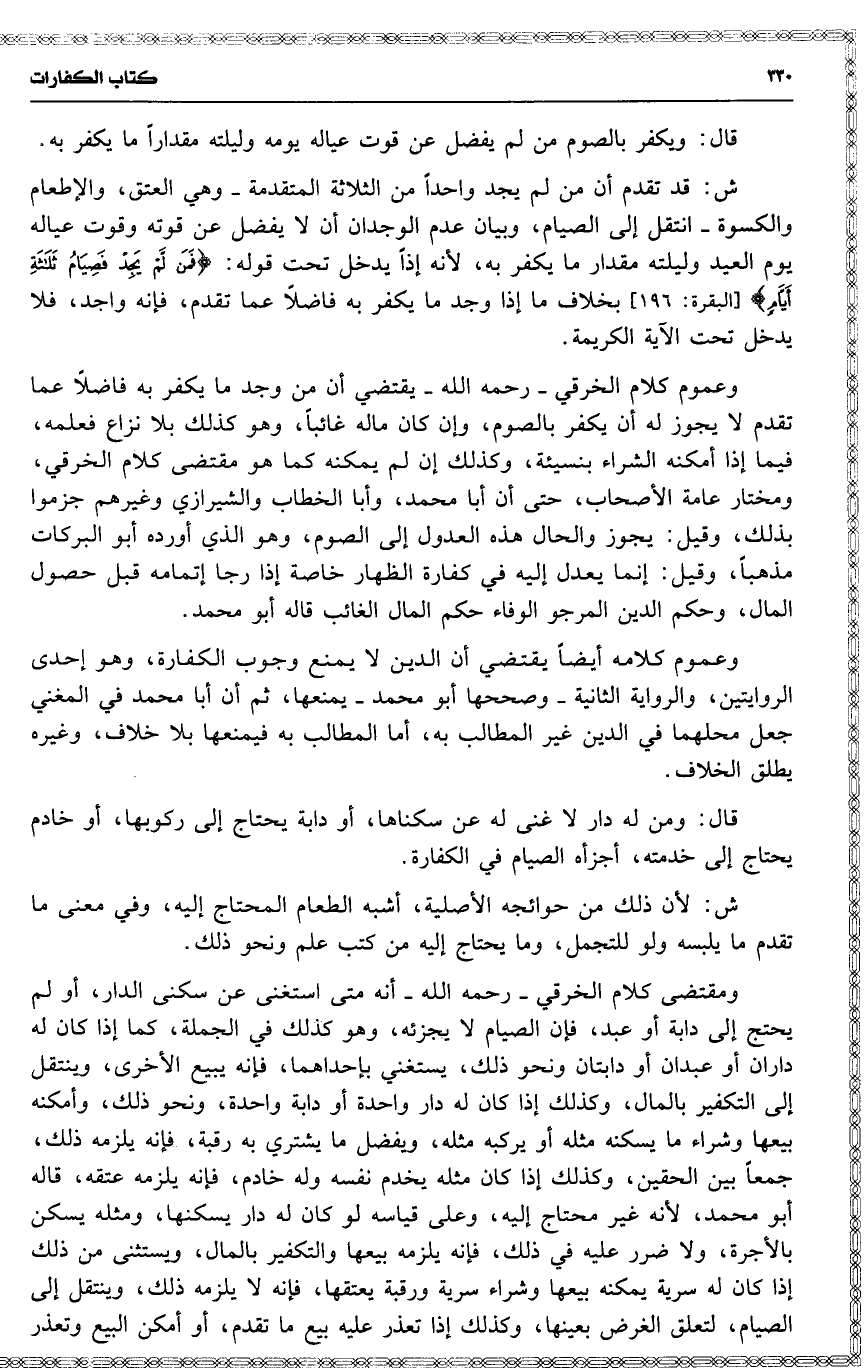 ومقتضى كلام الخرقي رحمه الله أنه متى استغنى عن سكنى الدار ، أو لم يحتج إلى دابة أو عبد ، فإن الصيام لا يجزئه ، وهو كذلك في الجملة ، كما إذا كان له داران أو عبدان أو دابتان ونحو ذلك ، يستغني بإحداهما ، فإنه يبيع الأخرى ، وينتقل إلى التكفير بالمال ، وكذلك إذا كان له دار واحدة أو دابة واحدة ، ونحو ذلك ، وأمكنه بيعها وشراء ما يسكنه مثله أو يركبه مثله ، ويفضل ما يشتري به رقبة ، فإنه يلزمه ذلك ، جمعا بين الحقين ، وكذلك إذا كان مثله يخدم نفسه وله خادم ، فإنه يلزمه عتقه ، قاله أبو محمد ، لأنه غير محتاج إليه ، وعلى قياسه لو كان له دار يسكنها ، ومثله يسكن بالأجرة ، ولا ضرر عليه في ذلك ، فإنه يلزمه بيعها والتكفير بالمال ، ويستثنى من ذلك إذا كان له سرية يمكنه بيعها وشراء سرية ورقبة يعتقها ، فإنه لا يلزمه ذلك ، وينتقل إلى الصيام ، لتعلق الغرض بعينها ، وكذلك إذا تعذر عليه بيع ما تقدم ، أو أمكن البيع وتعذر