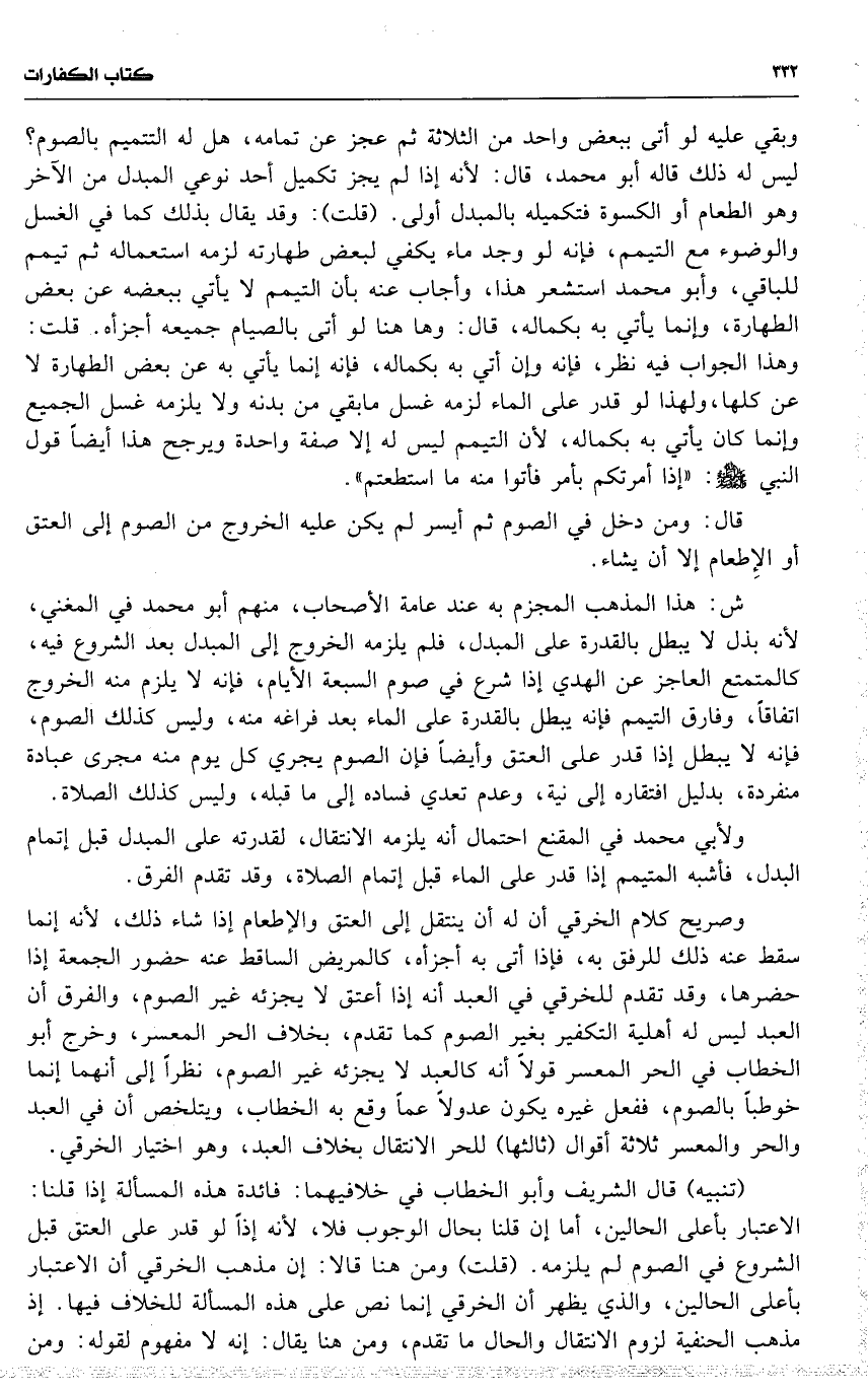 وصريح كلامن الخرقي أن له أن ينتقل إلى العتق والإطعام إذا شاء ذلك ، لأنه إنما سقط عنه ذلك للرفق به ، فإذا أتى به أجزأه ، كالمريض الساقط عنه حضور الجمعة إذا حضرها ، وقد تقدم للخرقي في العبد أنه إذا أعتق لا يجزئه غير الصوم ، والفرق أن العبد ليس له أهلية التكفير بغير الصوم كما تقدم ، بخلاف الحر المعسر ، وخرج أبو الخطاب في الحر المعسر قولًا أنه كالعبد لا يجزئه غير الصوم ، نظراً إلى أنهما إنما خوطباً بالصوم ، ففعل غيره يكون عدولًا عماً وقع به الخطاب ، ويتلخص أن في العبد والحر والمعسر ثلاثة أقوال ( ثالثها ) للحر الانتقال بخلاف العبد ، وهو اختيار الخرقي .