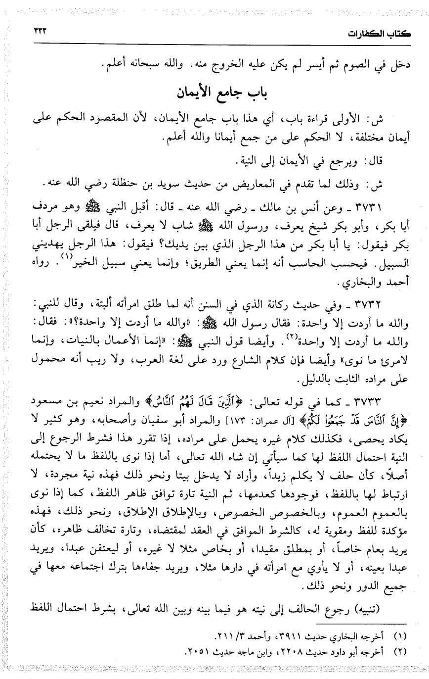 3732 وفي حديث ركانة الذي في السنن أنه لما طلق امرأته ألبتة، وقال للنبي: والله ما أردت إلا واحدة: فقال رسول الله: (والله ما أردت إلا واحد): فقال رسول الله: (والله ما أردت إلا واحدة؟) فقال: والله ما أردت إلا واحدة. وأيضا قول النبي: (إنما الأعمال بالنيات، وإنما لامرئ ما نوى) وأيضا فإن كلام الشارع ورد على لغة العرب، ولا ريب أنه محمول على مراده الثابت بالدليل.
