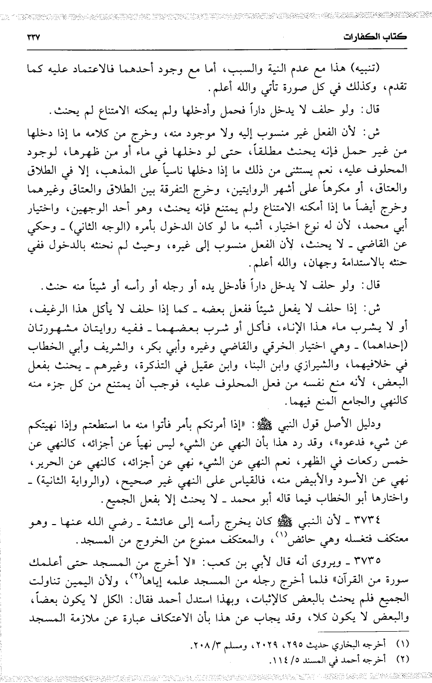 3735 ويروى أنه قال لأبي بن كعب : ( لا أخرج من المسجد حتى أعلمك سورة من القرآن ) فلما أخرج رجله من المسجد علمه إياها ، ولأن اليمين تناولت الجميع فلم يحنث بالبعض كالإثبات ، وبهذا استدل 16 ( أحمد ) فقال : الكل لا يكون بعضاً ، والبعض لا يكون كلا ، وقد يجاب عن هذا بأن الاعتكاف عبارة عن ملازمة المسجد