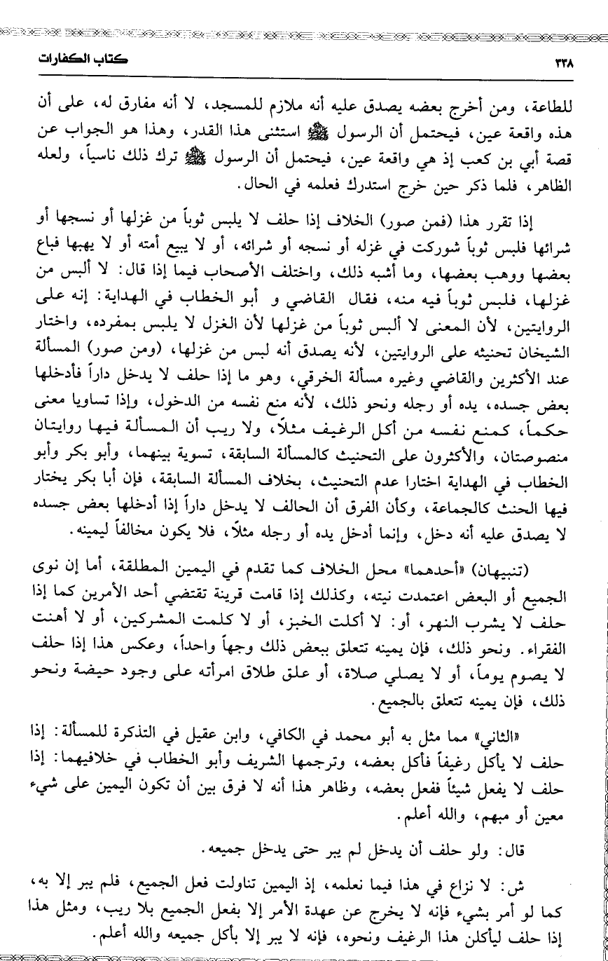 إذا تقرر هذا ( فمن صور ) الخلاف إذا حلف لا يلبس ثوباً من غزلها أو نسجها أو شرائها فلبس ثوباً شوركت في غزله أو نسجه أو شرائه ، أو لا يبيع أمته أو لا يهبها فباع بعضها ووهب بعضها ، وما أشبه ذلك ، واختلف الأصحاب فيما إذا قال : لا ألبس من غزلها ، فلبس ثوباً فيه منه ، فقال القاضي و أبو الخطاب في الهداية : إنه على الروايتين ، لأن المعنى لا ألبس ثوباً من غزلها لأن الغزل لا يلبس بمفرده ، واختار الشيخان تحنيثه على الروايتين ، لأنه يصدق أنه لبس من غزلها ، ( ومن صور ) المسألة عند الأكثرين والقاضي وغيره مسألة الخرقي ، وهو ما إذا حلف لا يدخل داراً فأدخلها بعض جسده ، يده أو رجله ونحو ذلك ، لأنه منع نفسه من الدخول ، وإذا تساويا معنى حكماً ، كمنع نفسه من أكل الرغيف مثلًا ، ولا ريب أن المسألة يها روايتان منصوصتان ، والأكثرون على التحنيث كالمسألة السابقة ، تسوية بينهما ، وأبو بكر وأبو الخطاب في الهداية اختارا عدم التحنيث ، بخلاف المسألة السابقة ، فإن أبا بكر يختار فيها الحنث كالجماعة ، وكأن الفرق أن الحالف لا يدخل داراً إذا أدخلها بعض جسده لا يصدق عليه أنه دخل ، وإنما أدخل يده أو رجله مثلًا ، فلا يكون مخالفاً ليمينه .