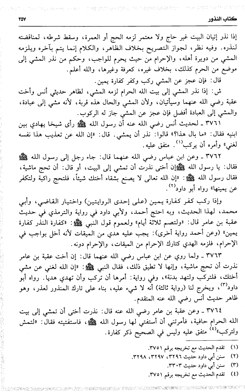 3761 لحديث أنس رضي الله عنه أن رسول الله رأى شيخا يهادي بين ابنيه فقال : ( ما بال هذا ؟ ) قالوا : نذر أن يمشي . قال : ( إن الله عن تعذيب هذا نفسه لغني ) وأمره أن يركب . متفق عليه .
